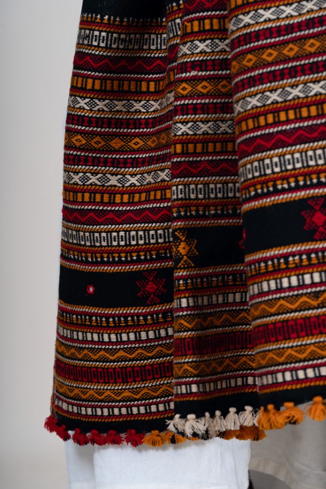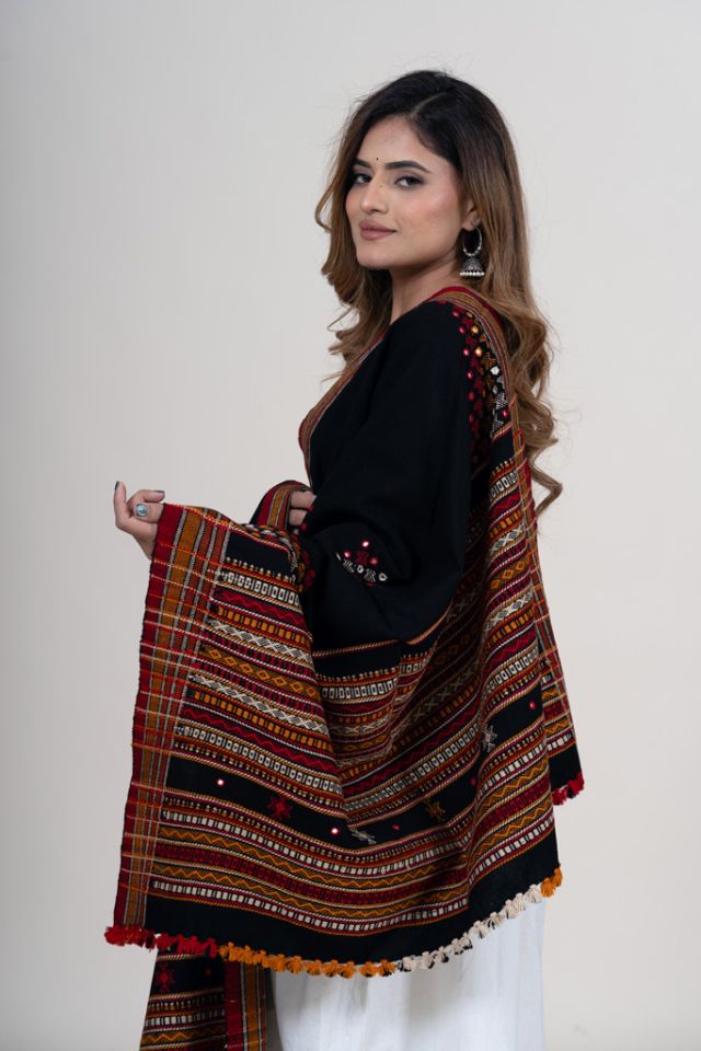 A handwoven black shawl featuring mirrored corner motifs and scattered buttas throughout the center, blending traditional artistry with modern elegance. Perfect for winter layering and cultural events. Made in soft, warm wool.