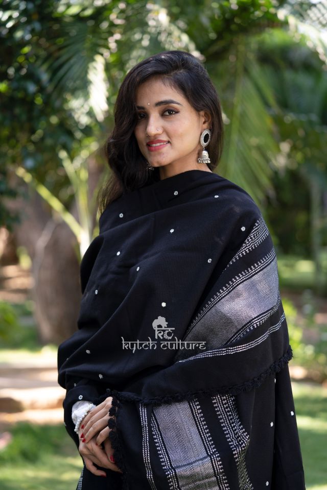 A timeless black shawl featuring intricate zari patterns and detailed mirror handwork, giving a bold and elegant finish suitable for any festive or winter ensemble. Made with quality acrylic wool for comfort.