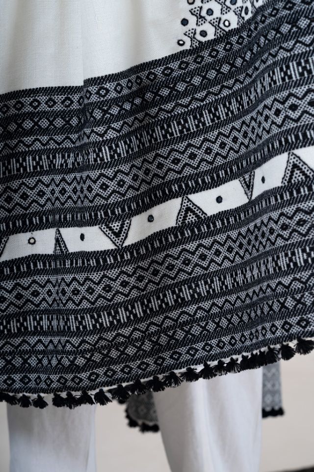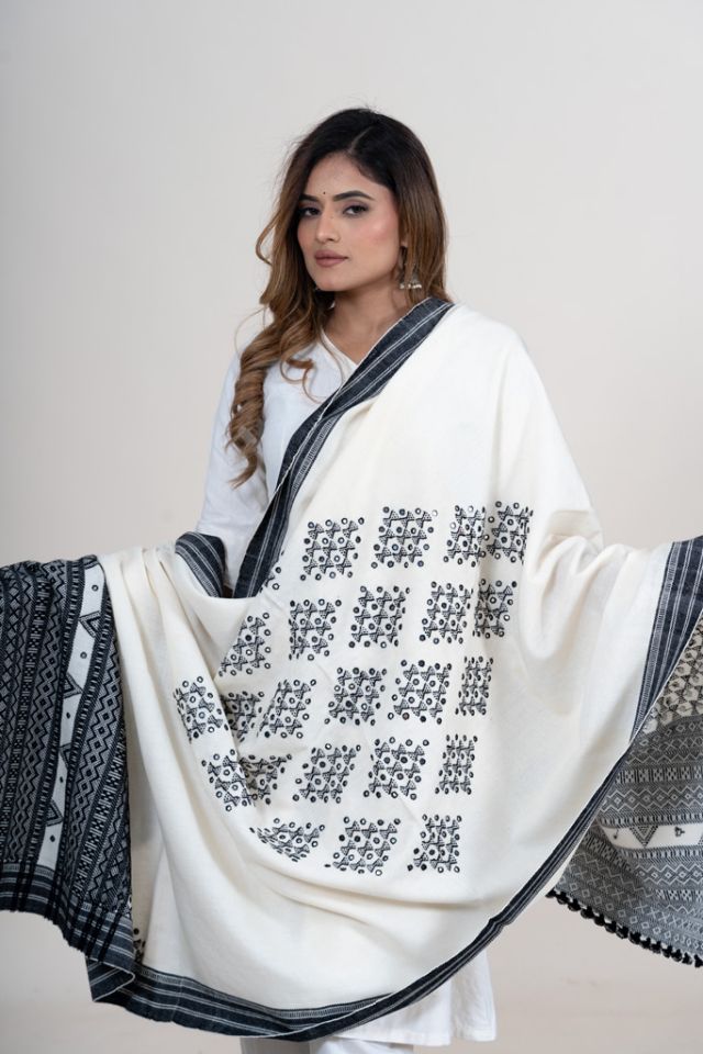 A classic black and white shawl highlighting a central butta design complemented by corner mirror motifs, reflecting authentic Kutch artistry. Great for festive and cultural styling. Woven from durable acrylic wool.