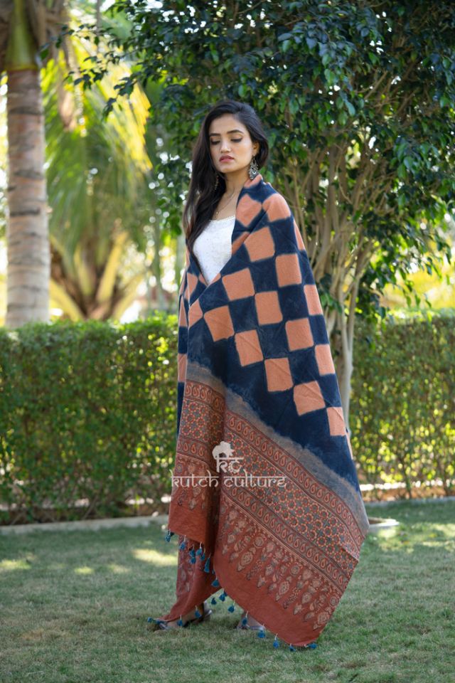 A versatile mix between a dupatta and a shawl, this blue and pink ajrakh work shawl is royal and regal and makes a sharp tool to have in your ethnic wardrobe. It features beautiful lace work and tassels to add flair and drama to it. It is a perfect accessory to add a little something more to your basic ethnic outfits.