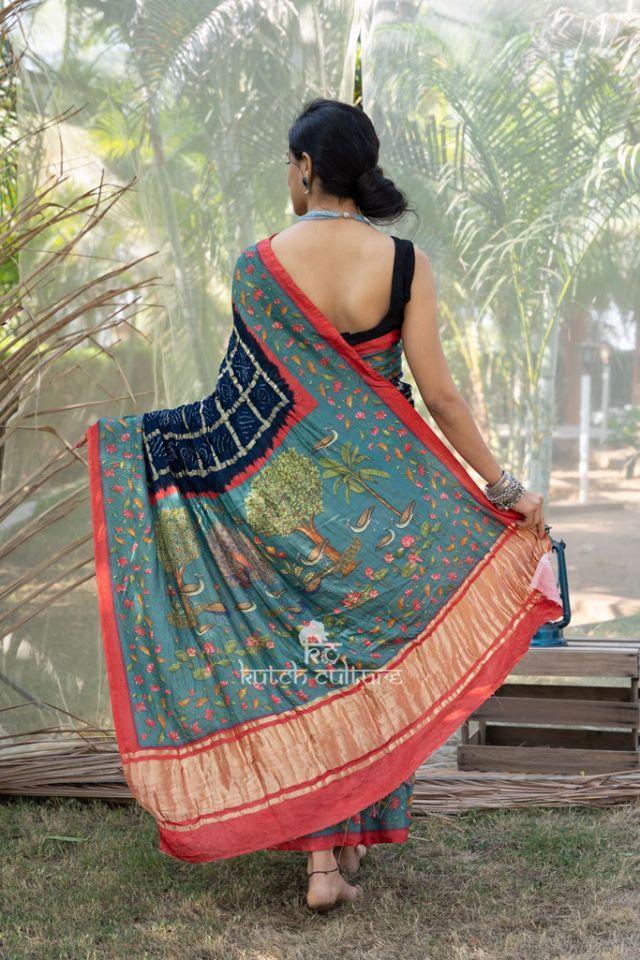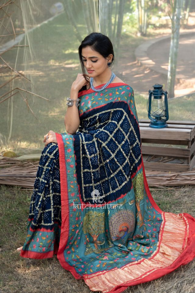 Look absolutely flawless in this gorgeous dark blue gharchola bandhej saree brought to you. Curated from the threads of the finest quality silk fabric, it gives a smooth feel to the skin and provides comfort at all times. The rich hue of blue fused with the gorgeously designed pichawai print bandhej looks absolutely eye-catching. Complement this saree with a pair of embellished flats, along with jhumkas and a diamond choker.