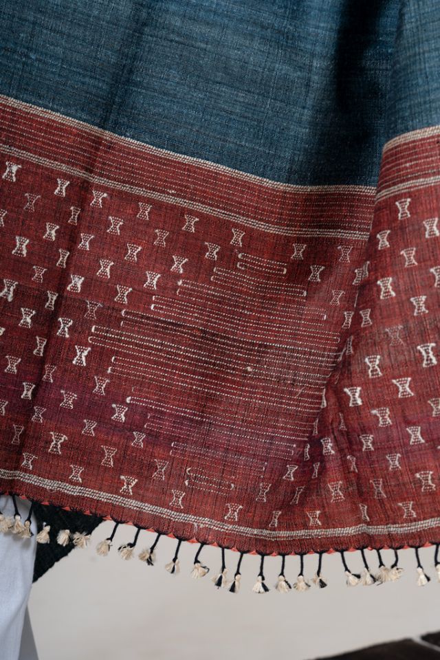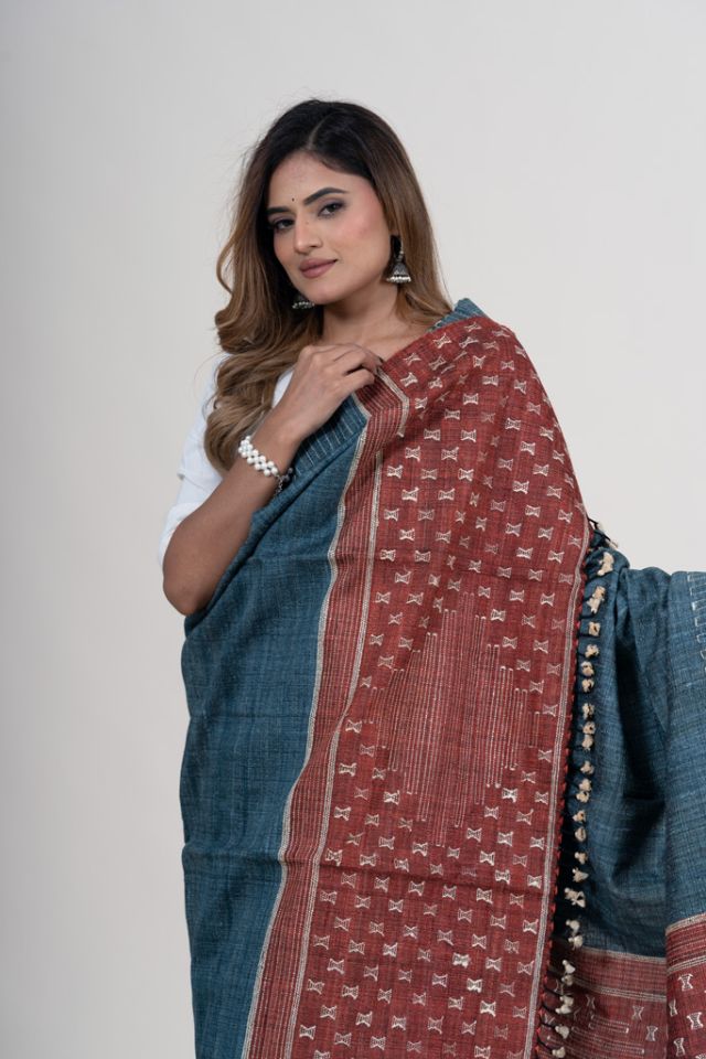 This blue and red dual-color shawl features premium merino wool handweaving and intricate tussar silk motifs on the borders. Warm, artistic, and classy — perfect for festive gatherings and winter elegance.
