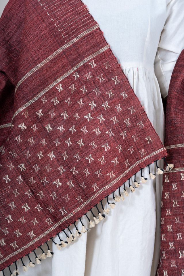 A rich burgundy shawl handwoven in pure merino wool, enhanced with fine tussar silk motifs. Its royal tone and artisan finish make it an elegant choice for luxurious winter styling.