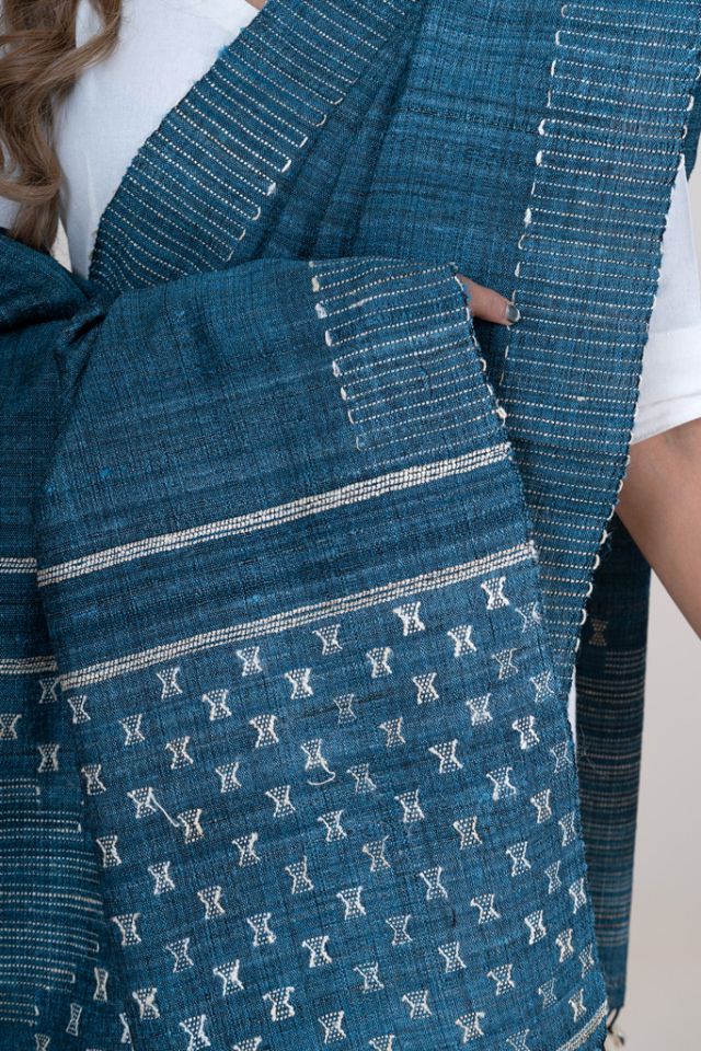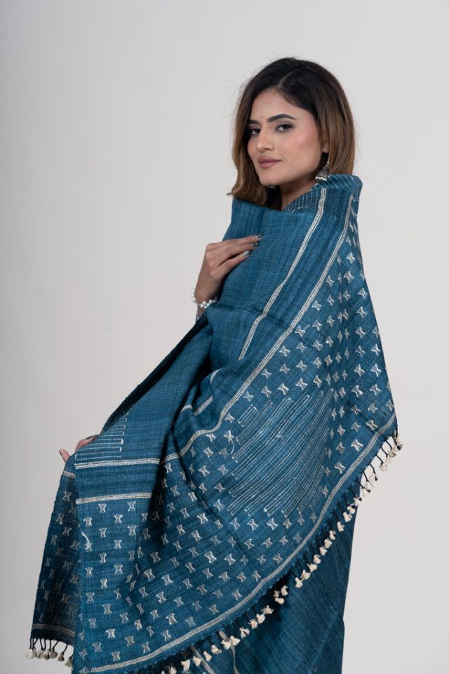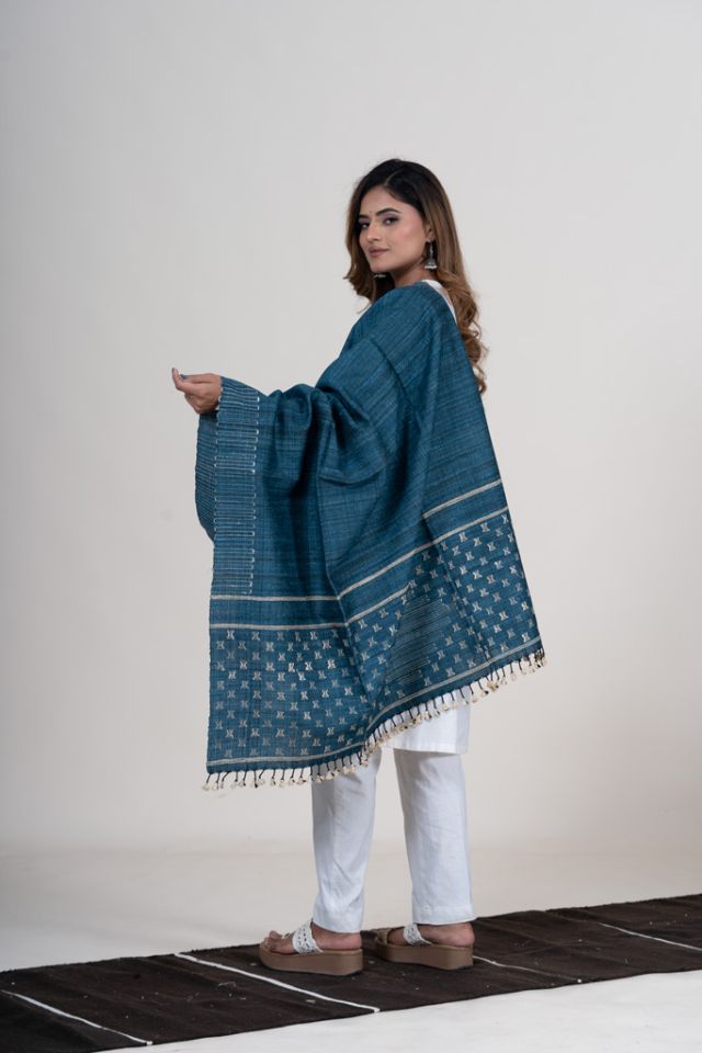 A sophisticated blue shawl crafted using traditional Kutch weaving techniques. Soft merino wool pairs beautifully with tussar silk motifs, making it a versatile accessory for both casual and festive looks.