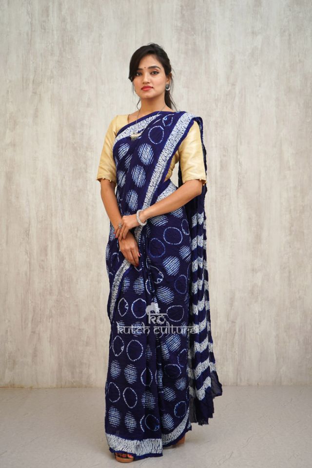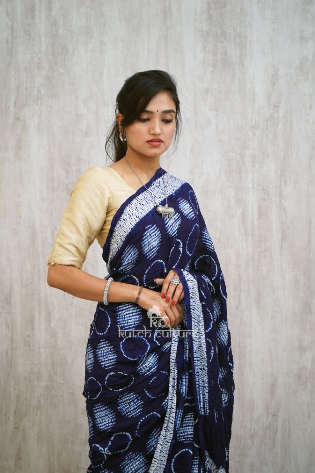 Beautifully crafted contemporary shibori design in Indigo Blue. This saree is designed to give you modern touch.Prints, this saree is a celebration of two vibrant cultures in one elegant drape.