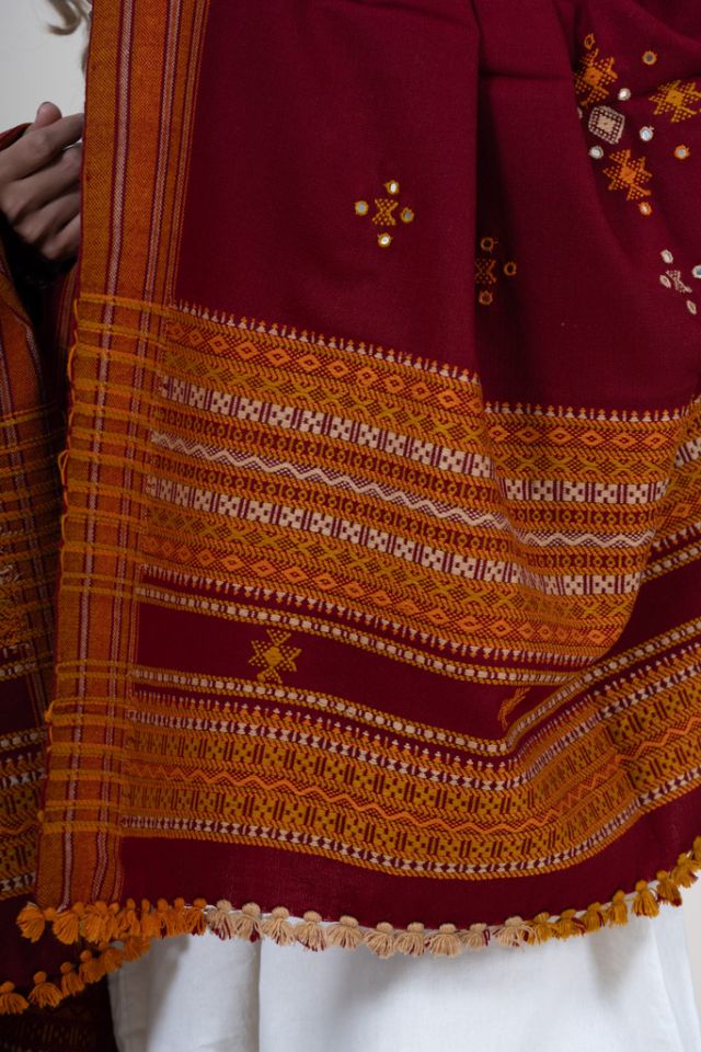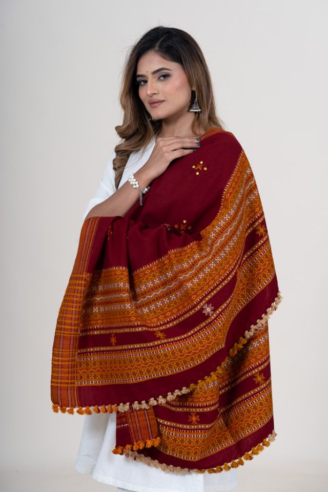 This deep maroon shawl showcases the timeless Chomukh weaving style, ideal for festive outfits and cultural gatherings. Woven using premium acrylic wool.