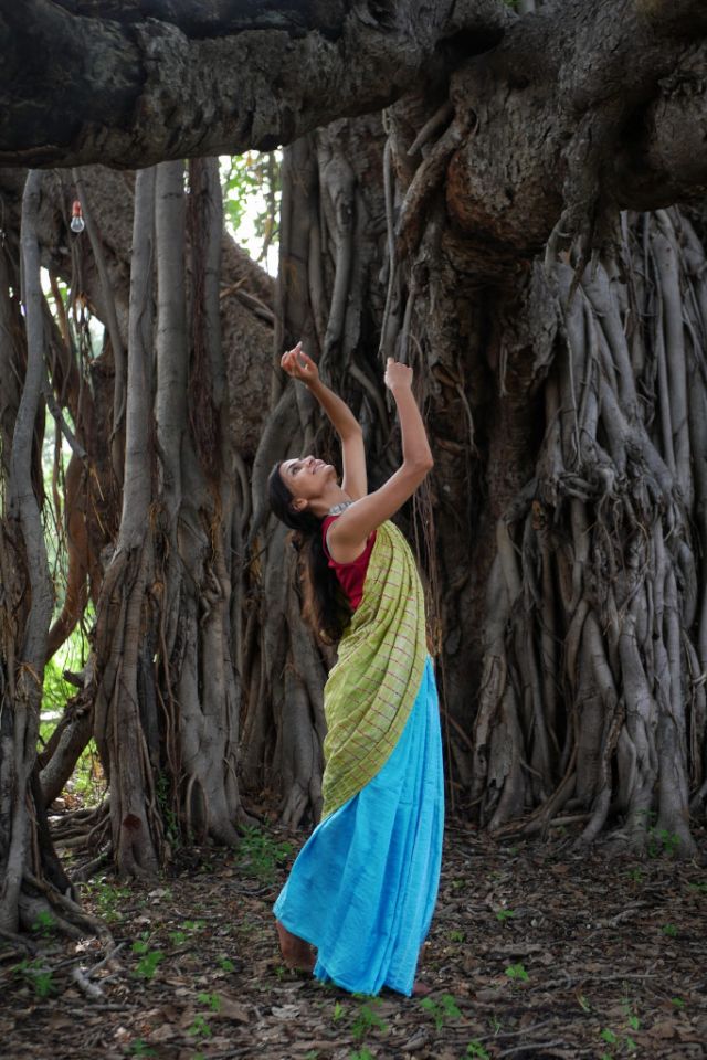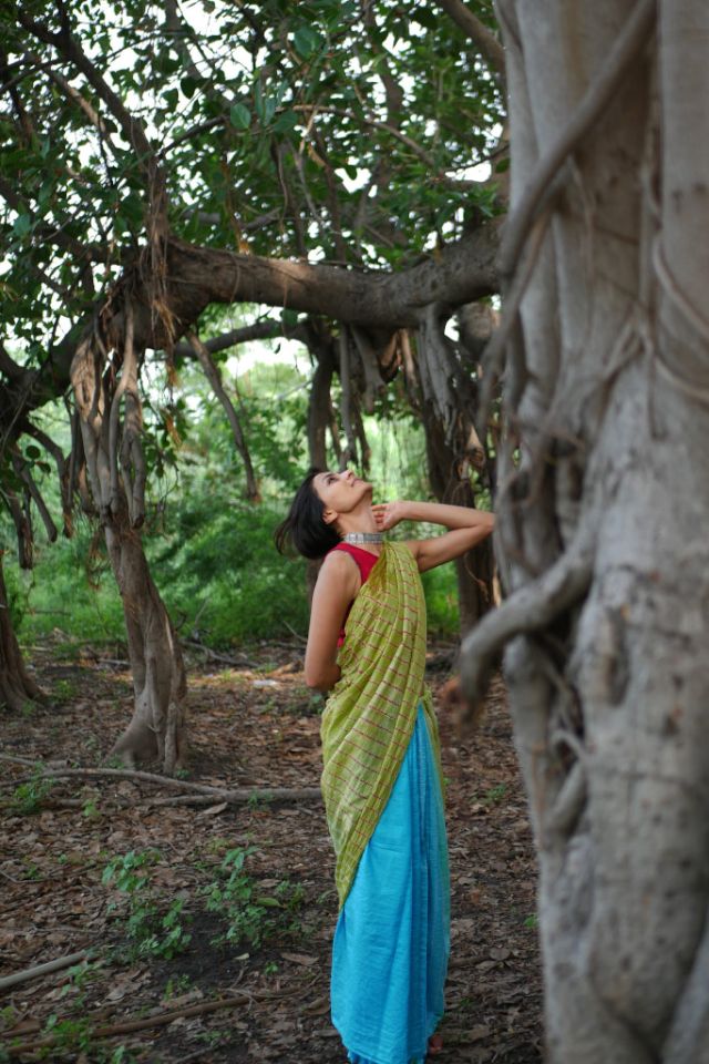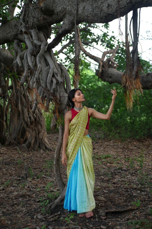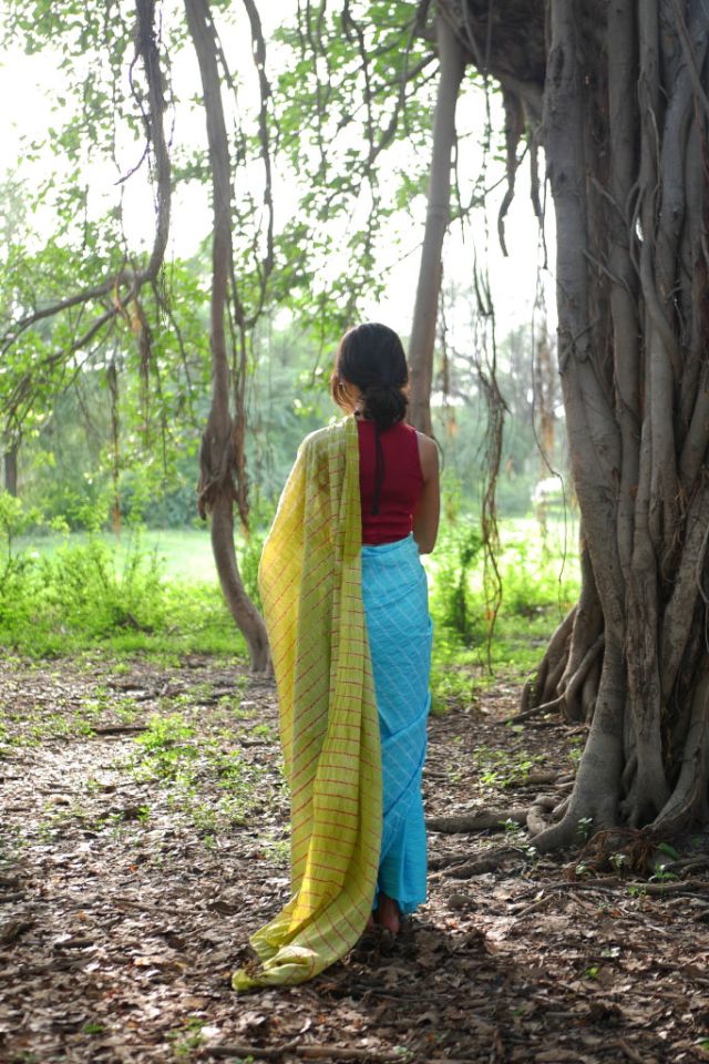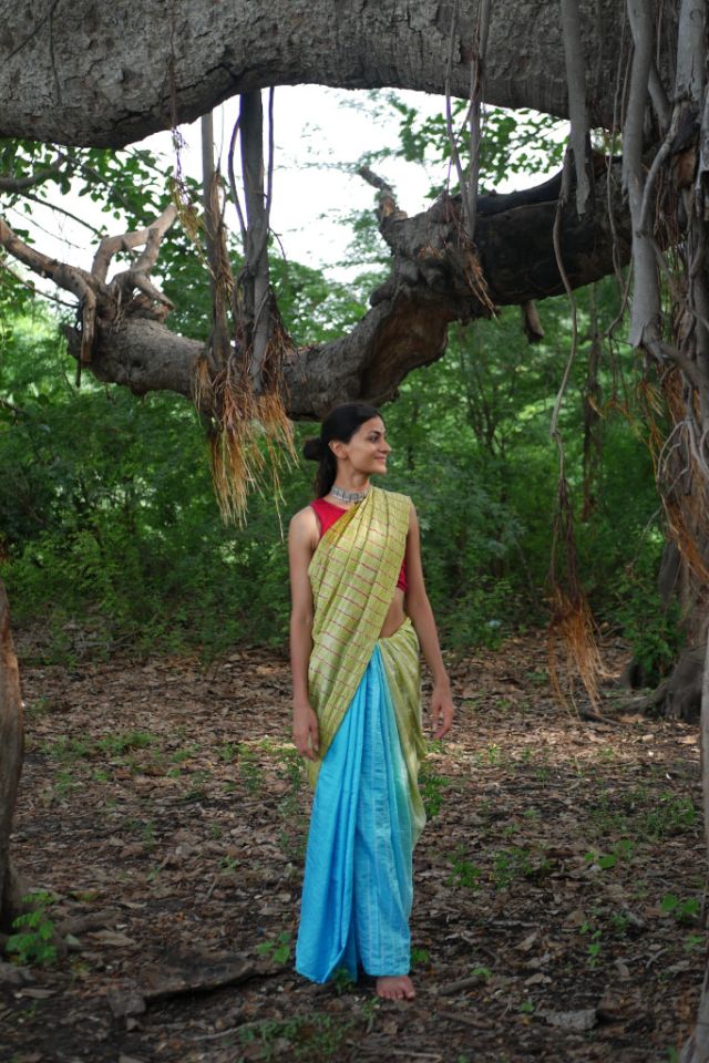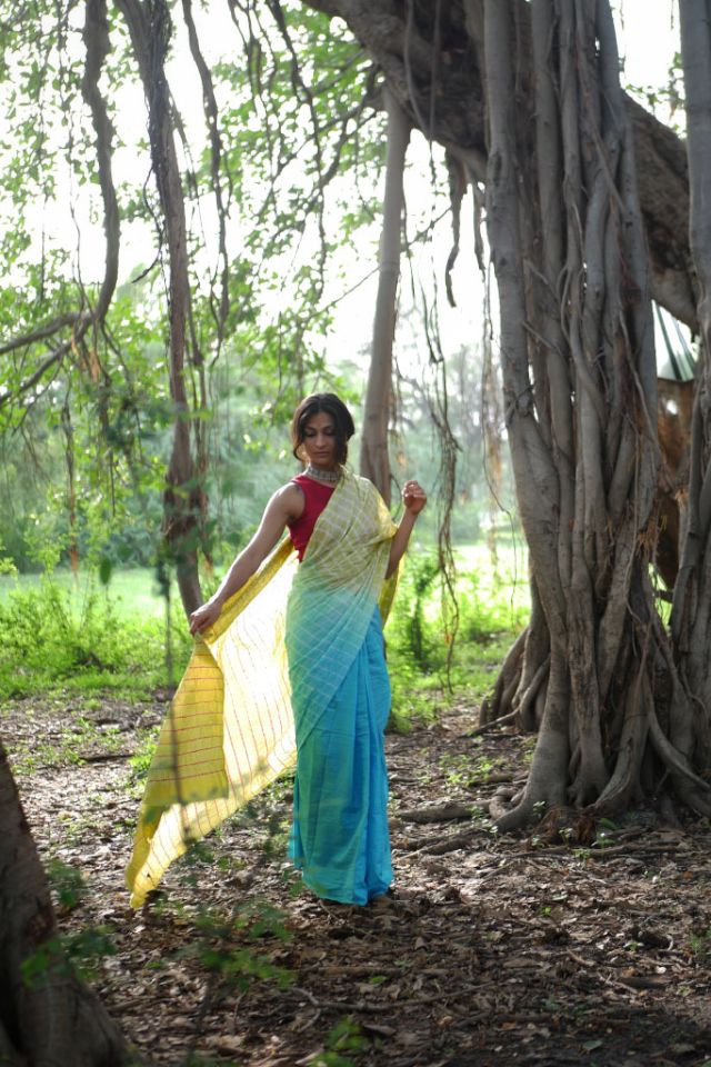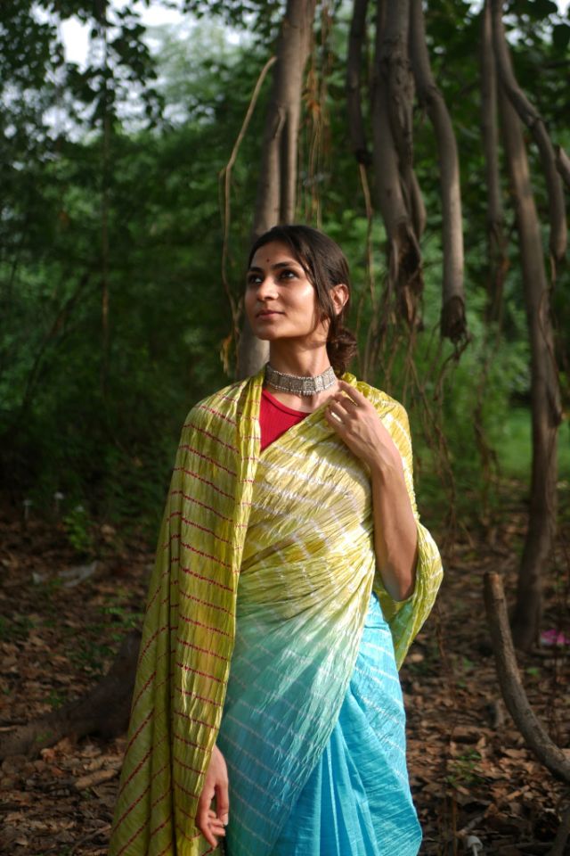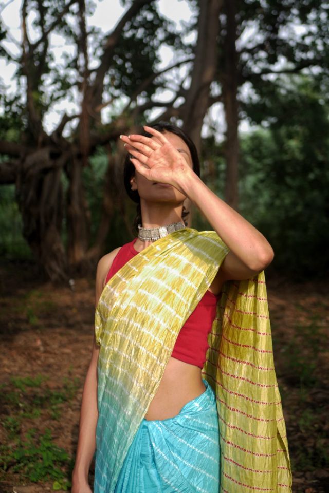 This stunning Mulberry silk saree features a graceful ombre-dyed body and an artistic Shibori design on the pallu, offering a perfect blend of tradition and modern style.