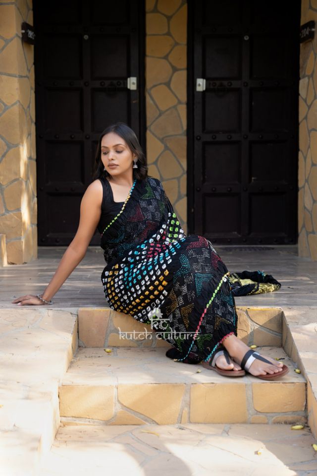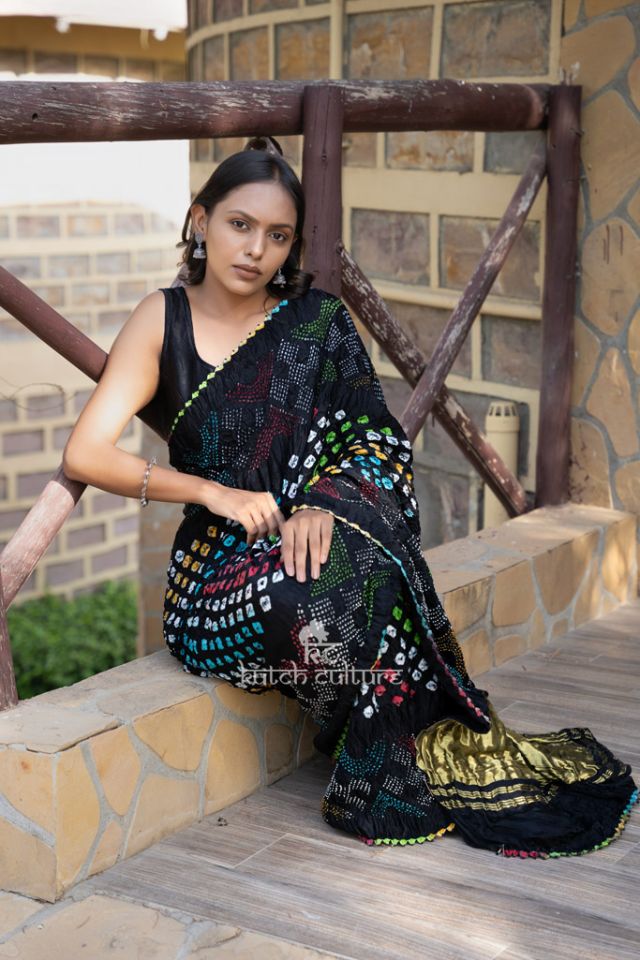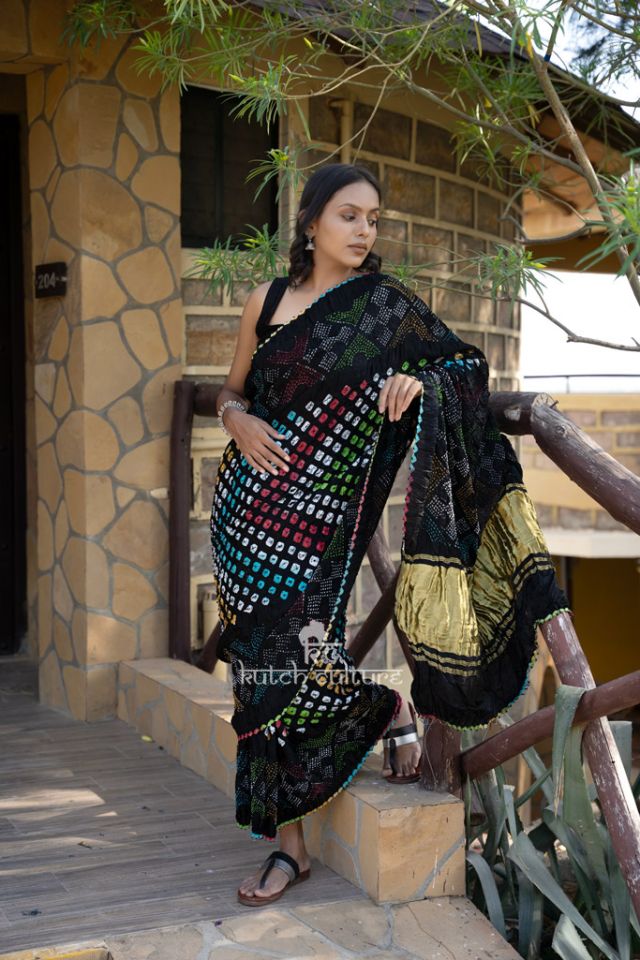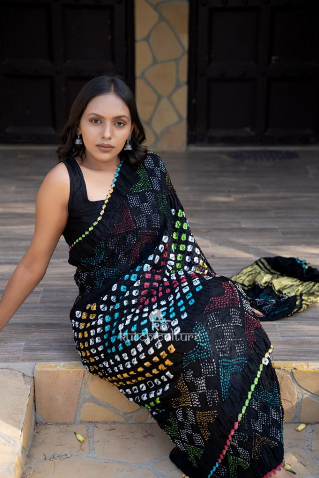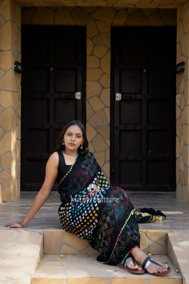 Exquisite Gajji Silk Bandhani Saree: Multicolor Beauty with Bold Center Dot Detail