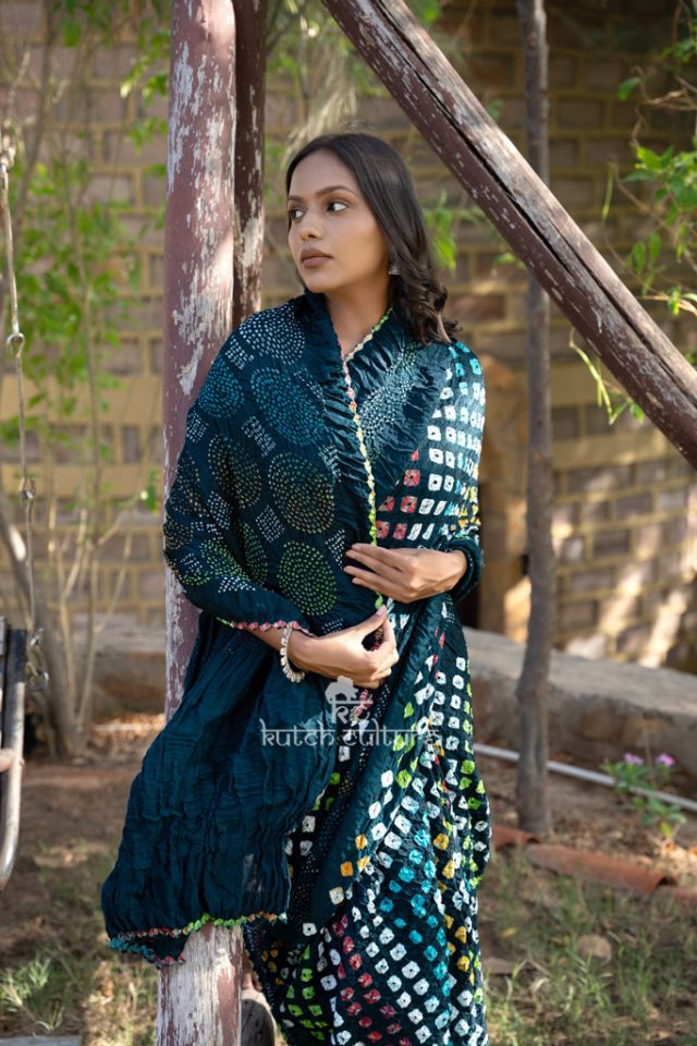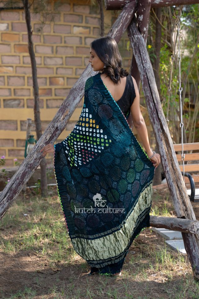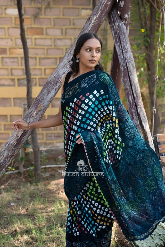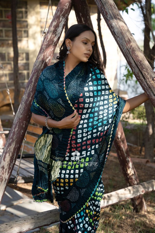 Step into the spotlight with our Gajji silk bandhej saree, adorned with a striking large central polka dot design amidst a vibrant tapestry of colors. Crafted with care and attention to detail, this saree is a symbol of timeless elegance.
