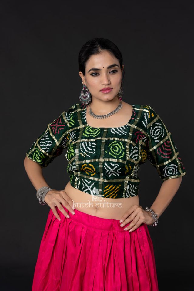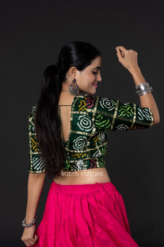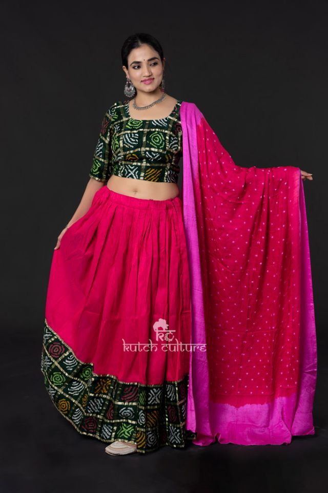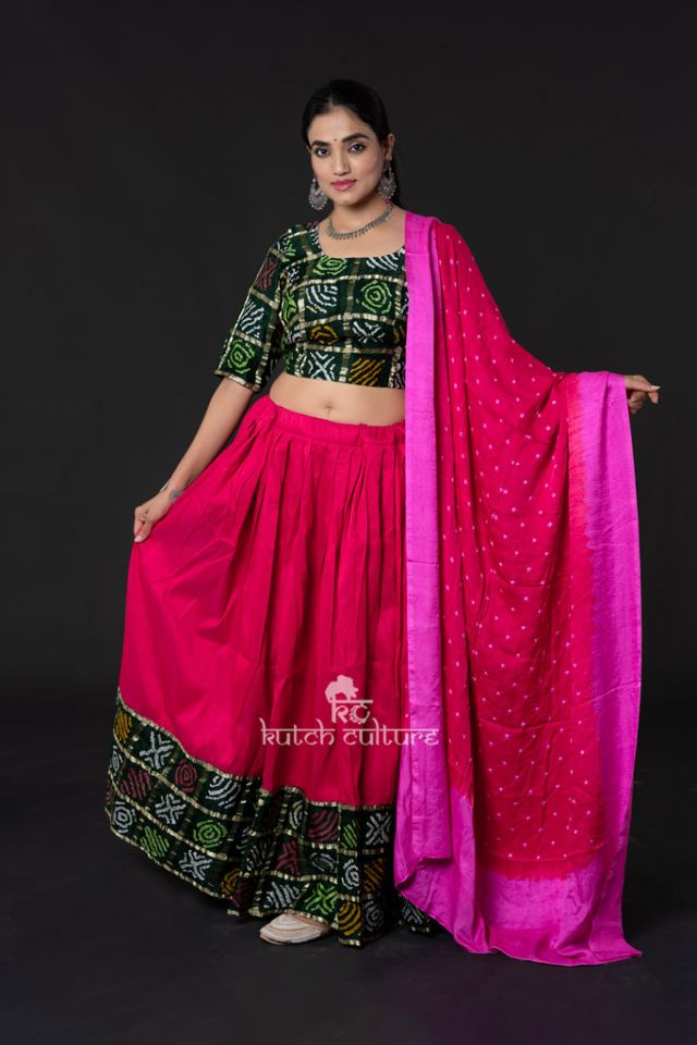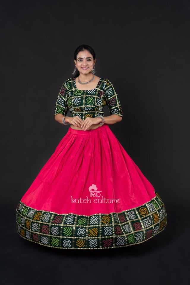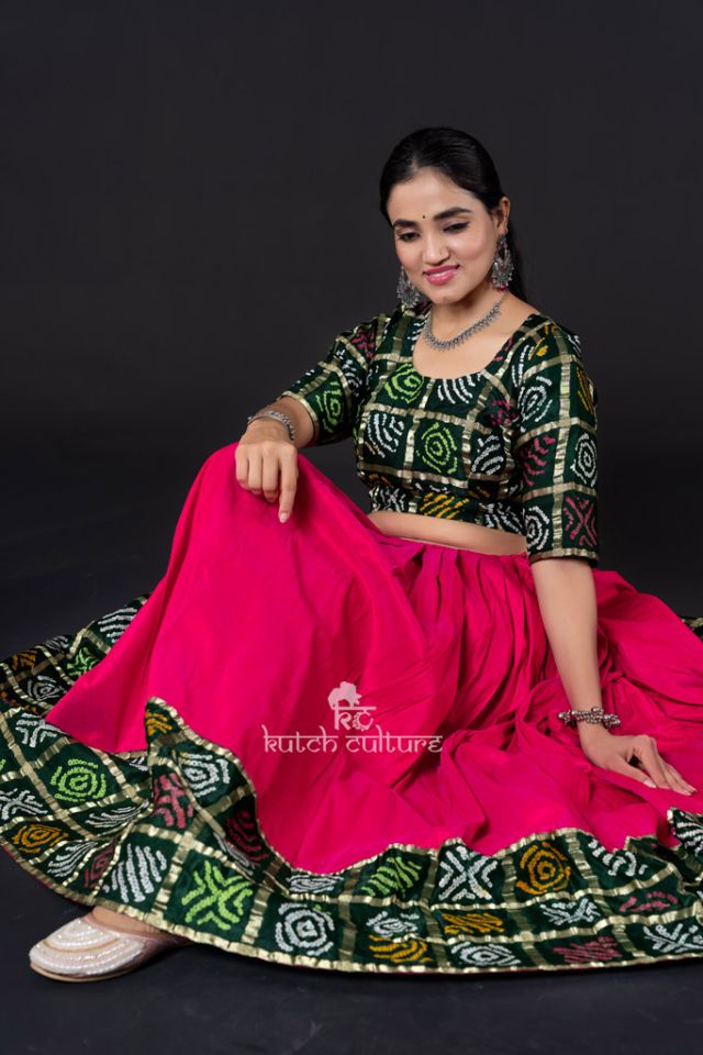 Embrace timeless tradition with this stunning Garchola style green and pink chaniya choli. Perfect for weddings, Navratri, and festive occasions, the intricate Garchola weaving highlights Gujarat's rich cultural heritage. The vibrant pink and green combination makes this attire a standout choice for any celebration, offering an elegant blend of classic style and modern grace.