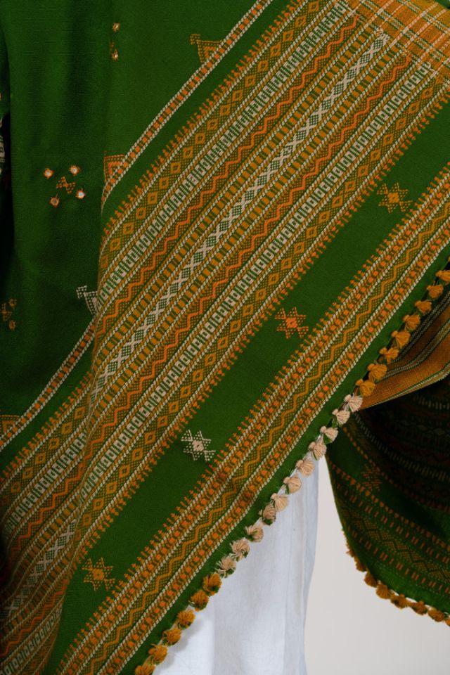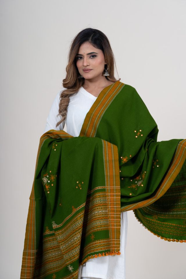 A vibrant green shawl highlighting the Chomukh pattern, reflecting the authentic craftsmanship of Kutch. Perfect for festive layering. Made using soft acrylic wool.