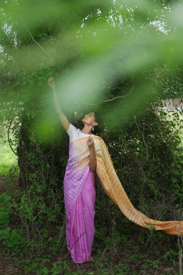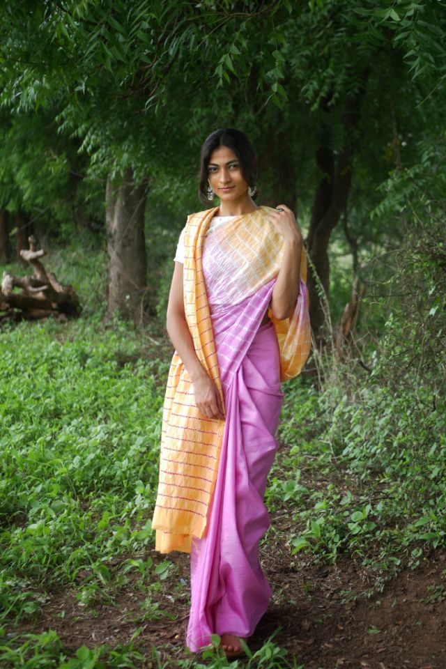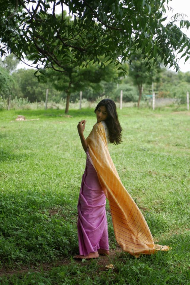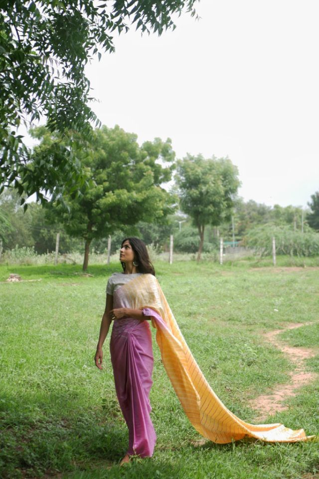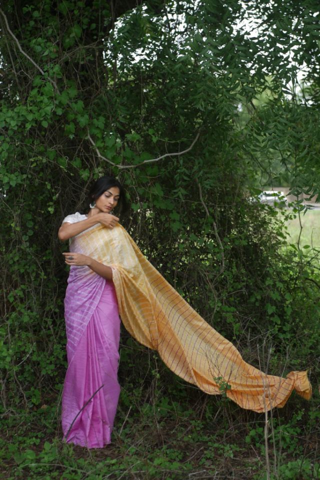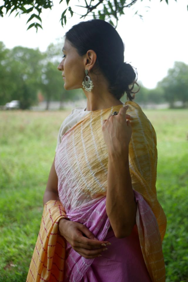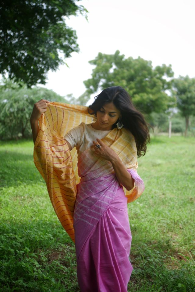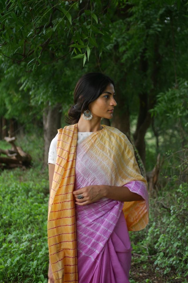 Handcrafted with care, this Mulberry silk saree features a stylish ombre design on the body and a beautifully detailed Shibori pallu, adding a touch of artistry to your ensemble.