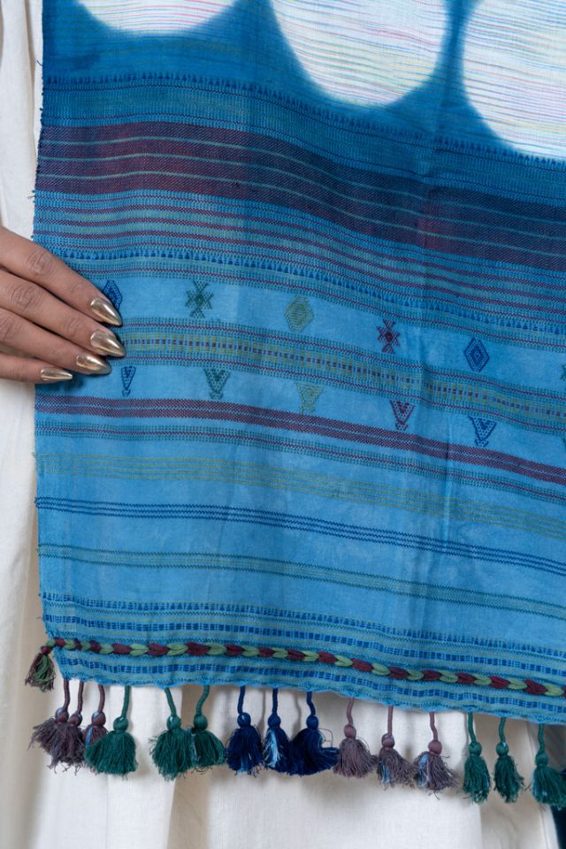This handwoven cotton dupatta features bold clamp-dye motifs in refreshing blue tones. Soft, lightweight, and expressive, it enhances everyday outfits with effortless style and cultural artistry.