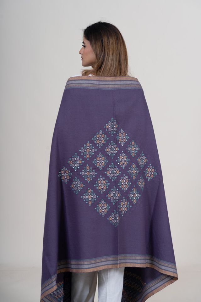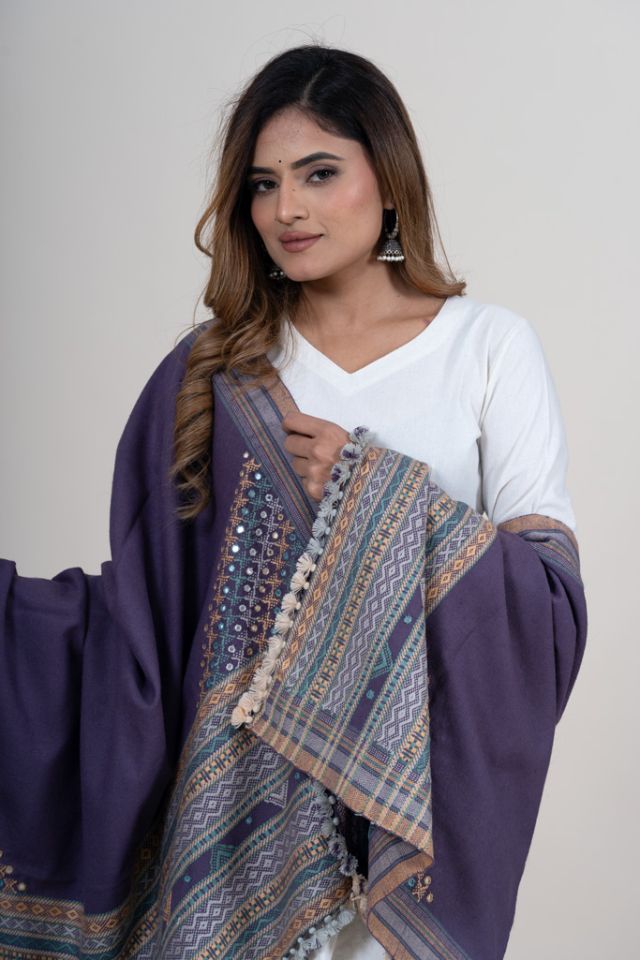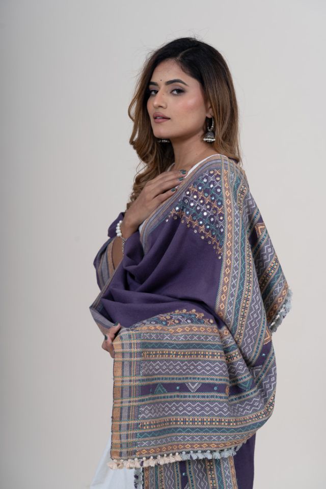 This elegant lavender shawl showcases a large central butta design with intricate Kutch motifs and shimmering mirror work on the corners. Ideal for celebrations, gifting, and ethnic winter wear. Made using premium acrylic wool.