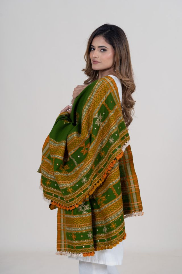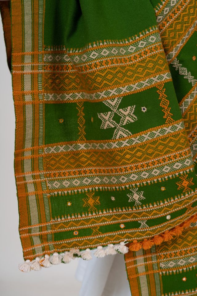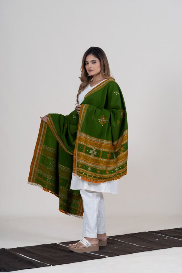 A vibrant green shawl showcasing detailed Kutch weaving enriched with sparkling mirror embroidery and classic motifs. Perfect for festive styling and statement winter looks. Crafted in soft acrylic wool.