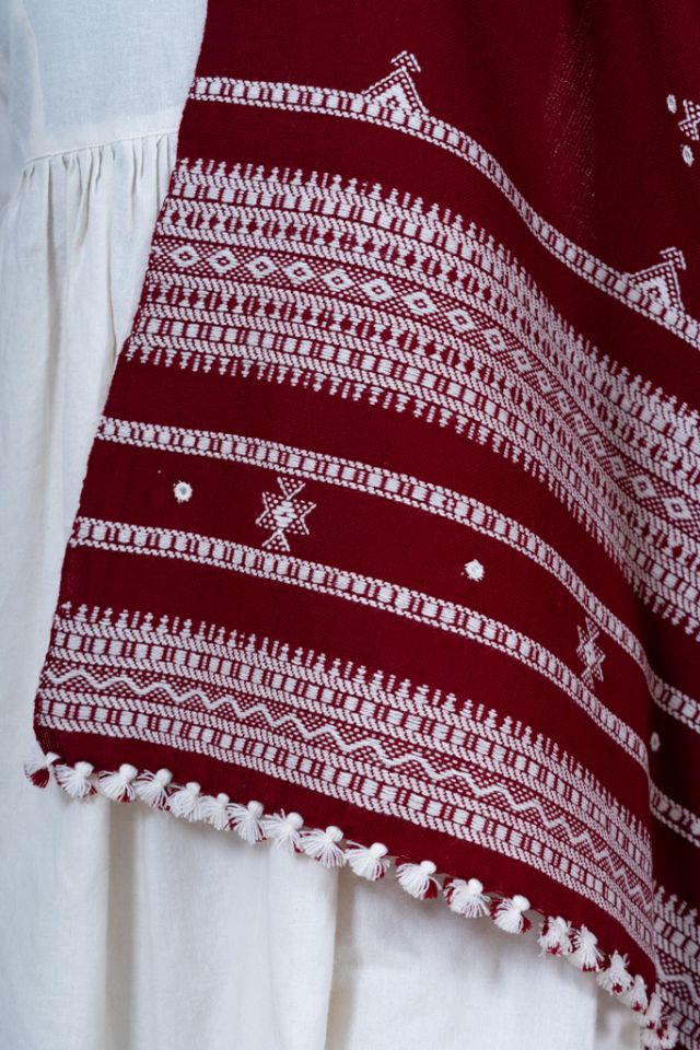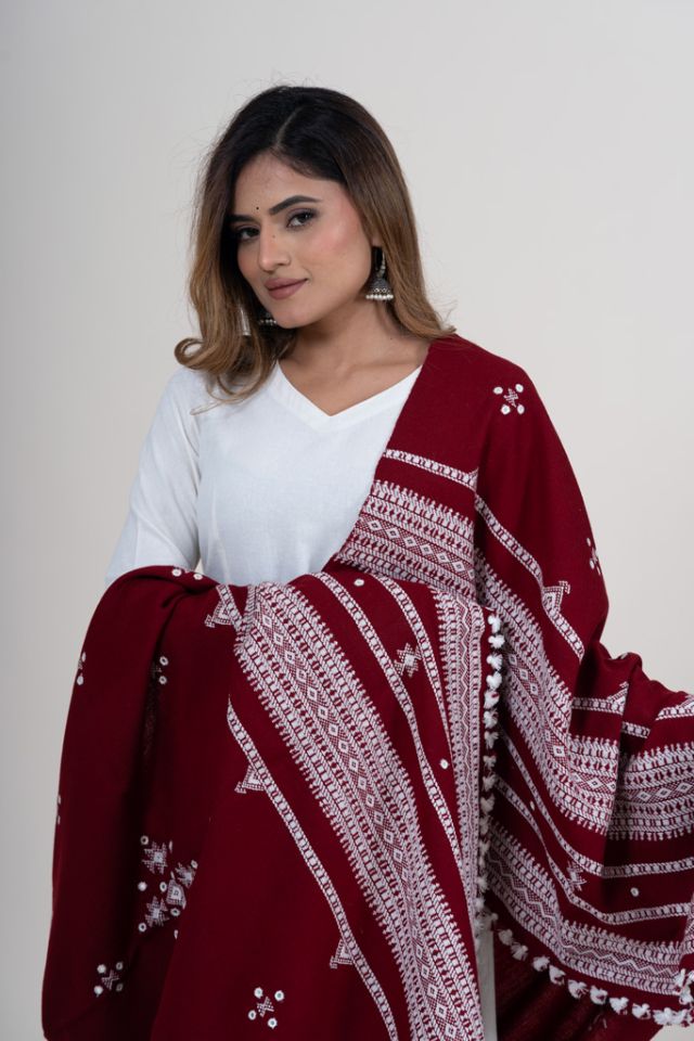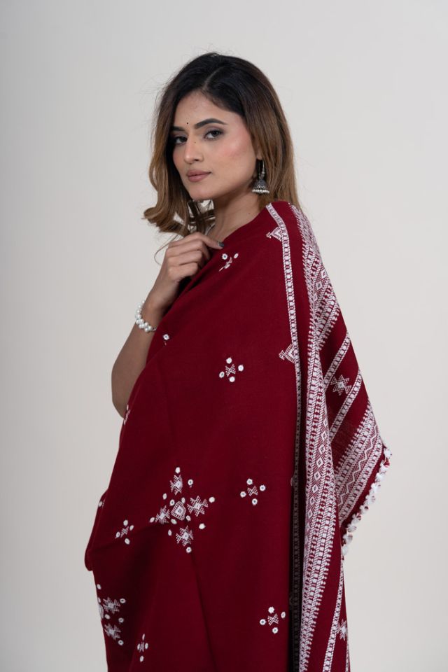 A deep maroon shawl woven with the authentic Chomukh pattern, bringing together tradition and bold style. Ideal for festive wear and gifting. Woven from durable acrylic wool.