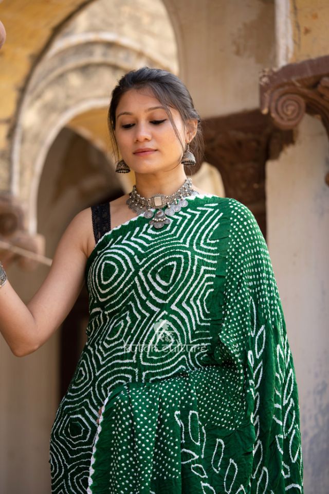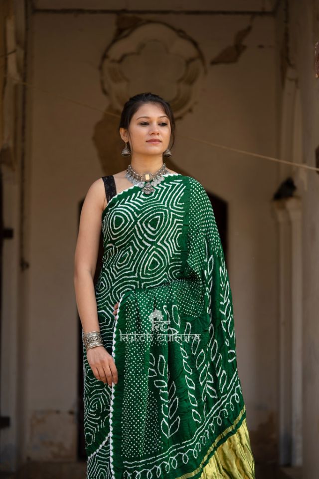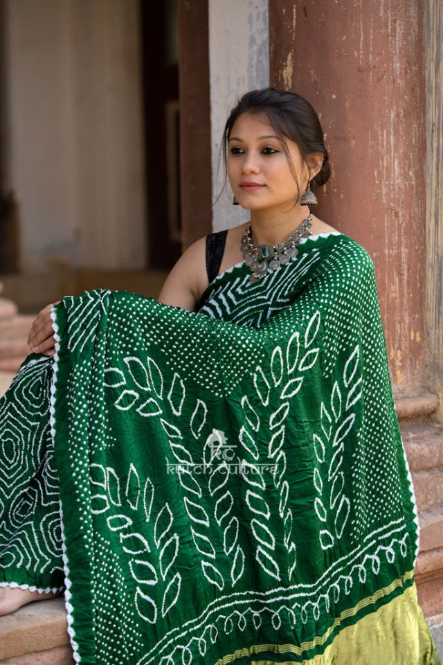 Beautifully Handcrafted mehndi green gajji silk bandhni saree. Add this beautiful Tie and Dye art to your wardrobe. There will be some irregularities as it is totally Handcrafted which will add natural beauty to the Product.