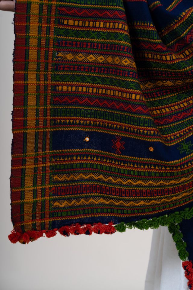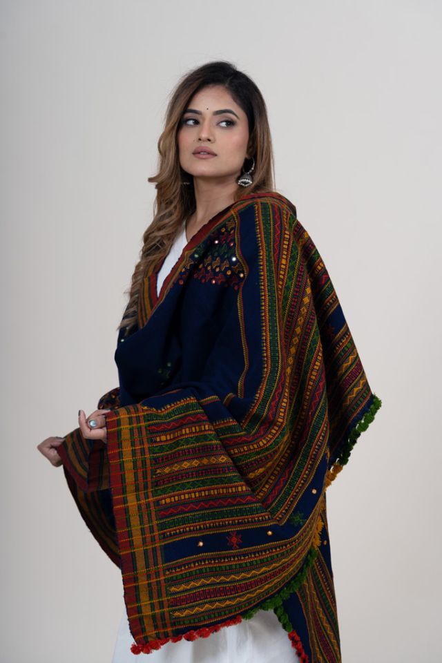 A beautifully crafted navy blue shawl featuring artistic mirrors and motifs in the corners, with scattered large and small buttas across the center. Perfect for festive occasions, ethnic winter wear, and elegant layering. Made from premium wool for warmth and comfort.
