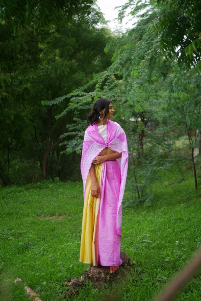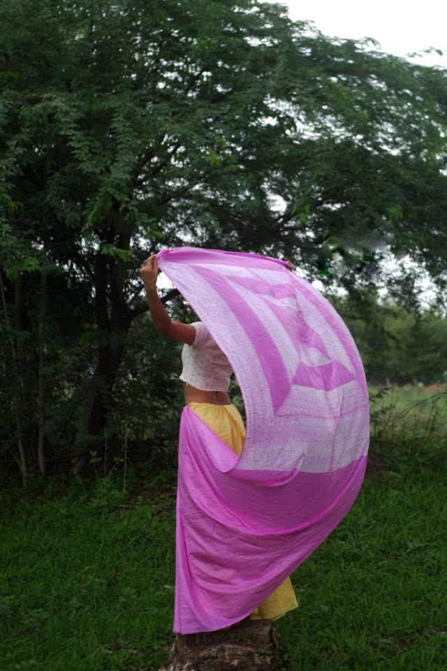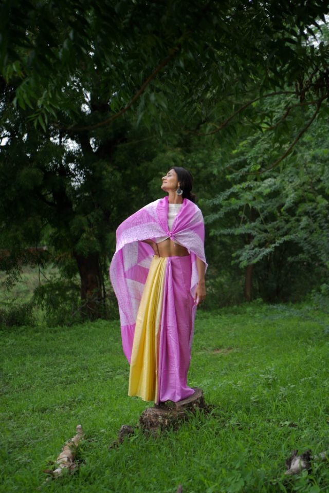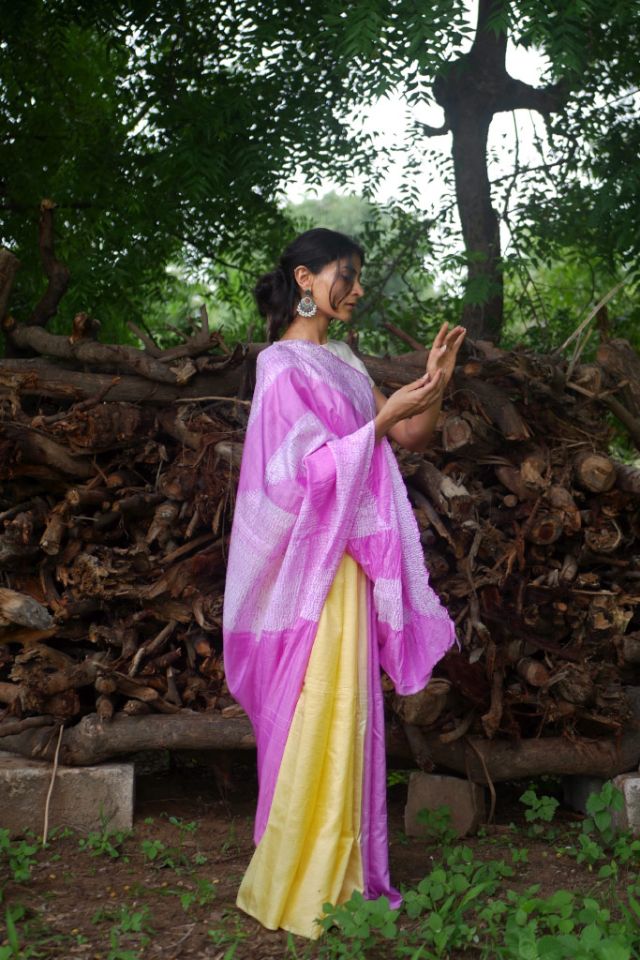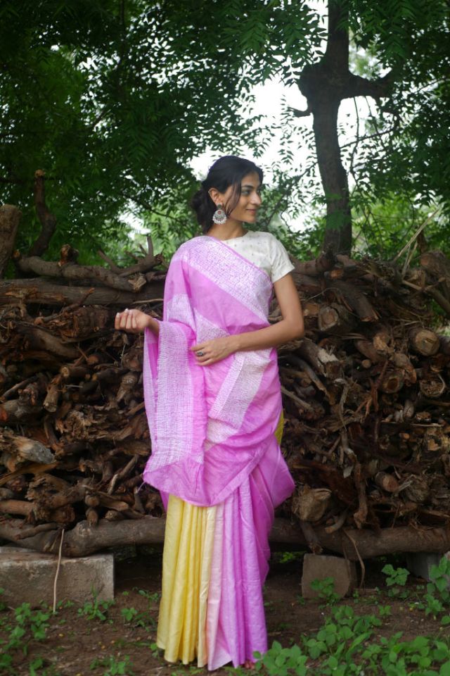 Stand out in this one-of-a-kind Mulberry silk saree, with its ombre-dyed body and a pallu that boasts a unique Shibori pattern, perfect for elegant gatherings.