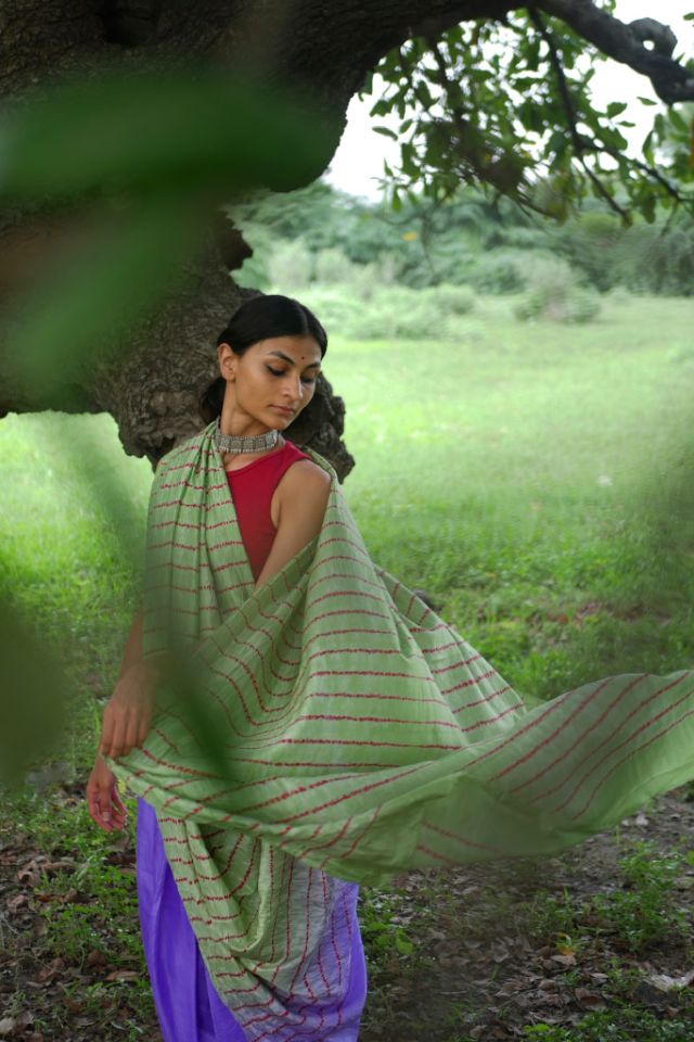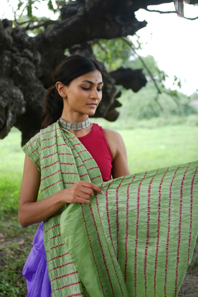 Enhance your wardrobe with this exquisite Mulberry silk saree, featuring a sophisticated ombre body and an intricate Shibori tie-dye pallu that exudes elegance.