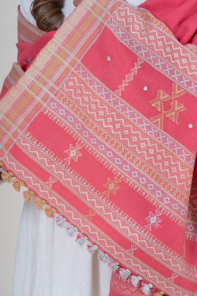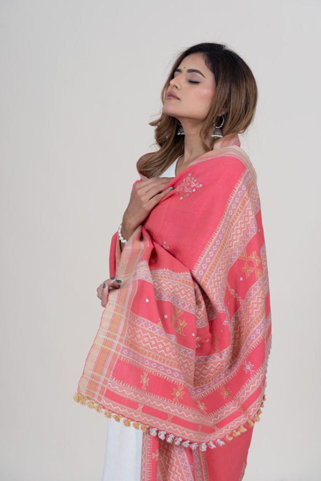 A soothing pastel pink shawl decorated with delicate motifs and fine mirror work, offering a graceful and feminine festive touch. Woven using high-quality acrylic wool.