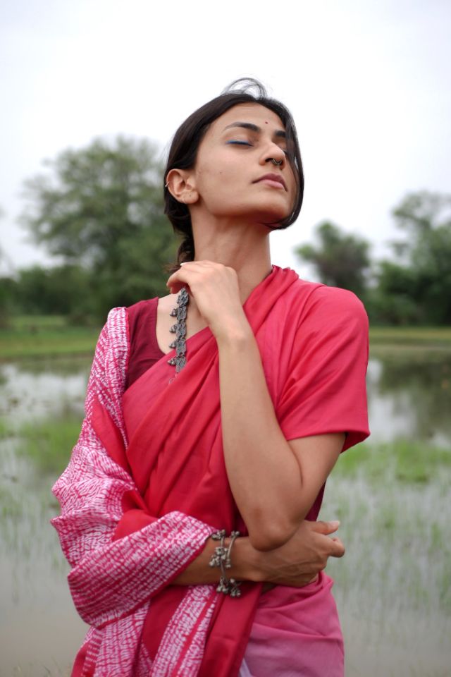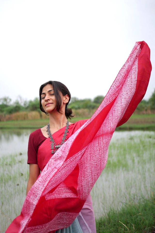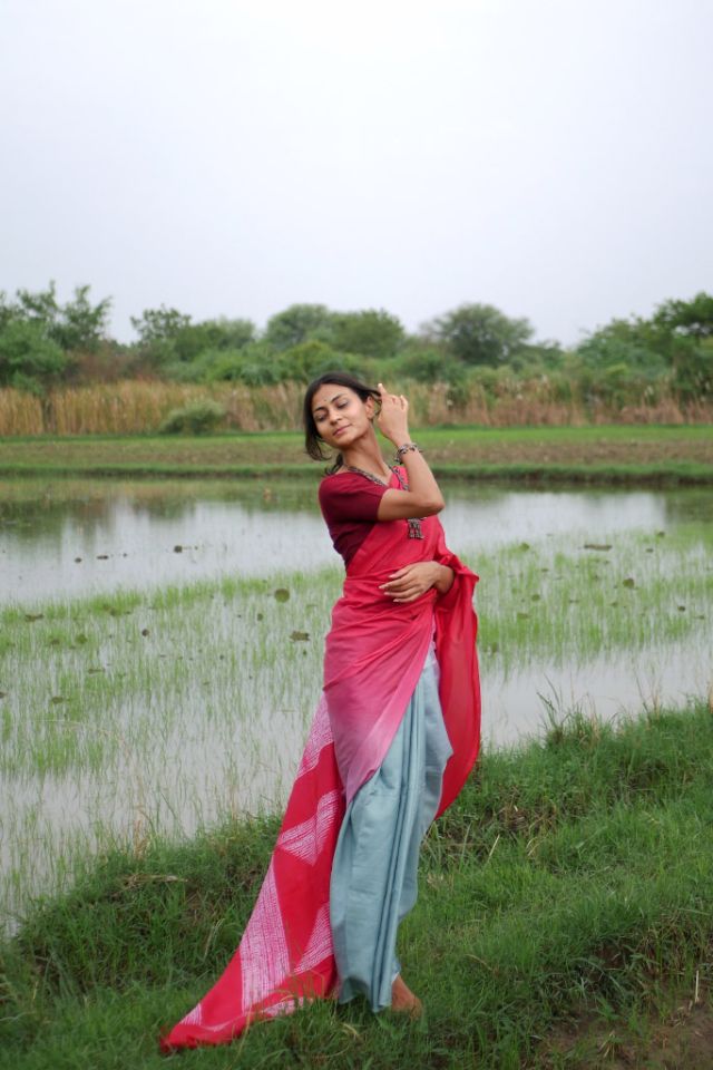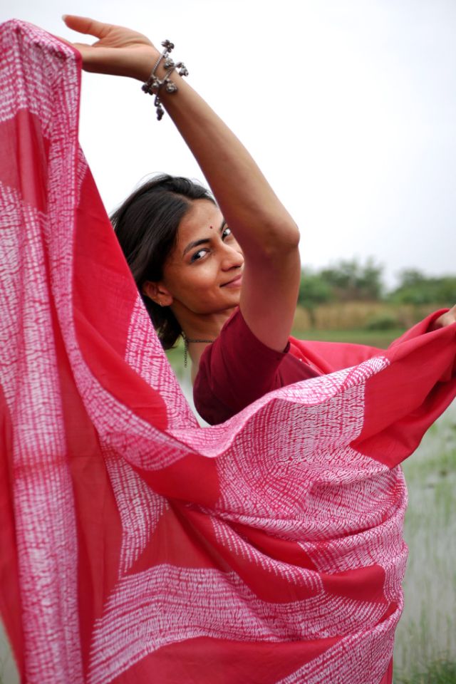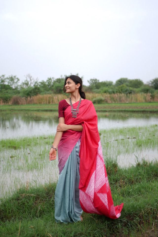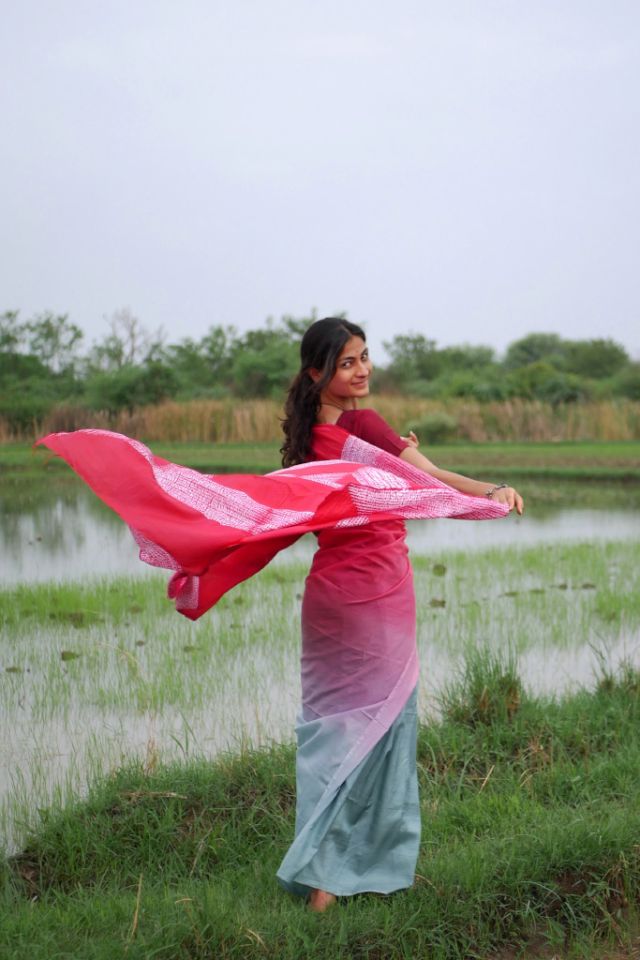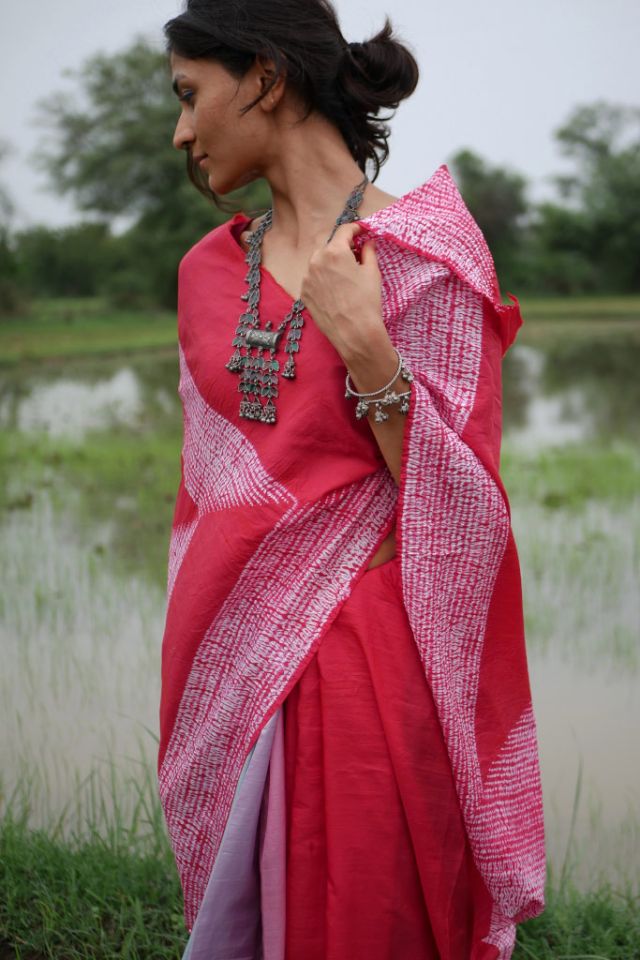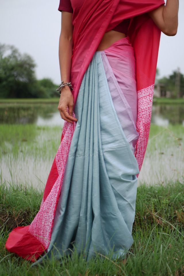 Indulge in the luxury of this Mulberry silk saree, featuring a premium ombre-dyed body and a pallu with exquisite Shibori detailing, designed for the discerning woman
