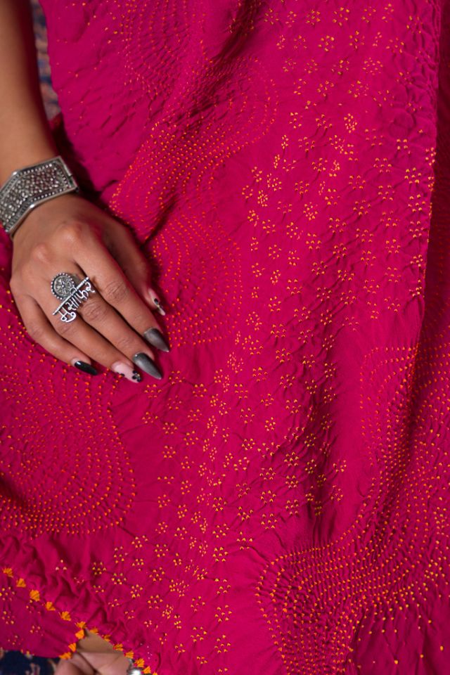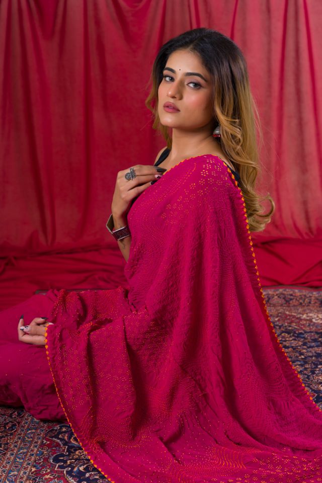 "This premium designer Rani Pink color Bandhani saree is a vibrant celebration of the soulful landscapes of Kutch,crafted on high-quality georgette fabric for a graceful, flowing drape.