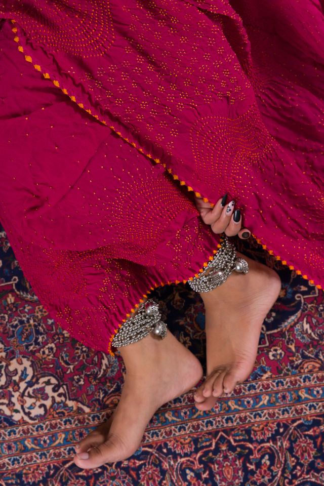 The highlight of this premium bandhni saree is its special dual-tone bandhej in orange and light yellow. The design is inspired by the Leriya saree, showing the smooth waves made by the wind blowing across the Great Rann of Kutch. With its simple yet bold style and minimal border, it is a must-have for any luxury collection."