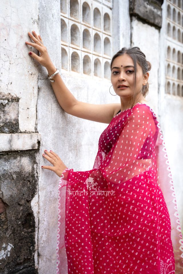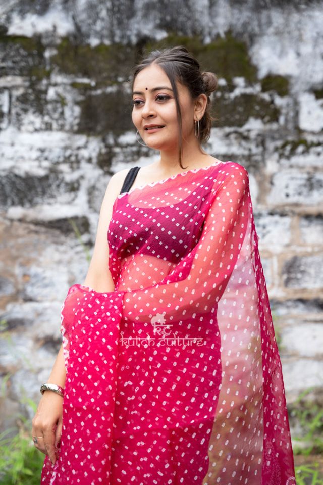 This Bandhani Organza Saree is the quintessential expression of delicateness, with its cascading stream of pinkish elegance. The rich pink body is adorned with bandhani dots and white flowery design, oozing rich opulence. The drapery’s one-of-a-kind artistry is quickly transformed into embellished grandeur by the self-brocade border with white border floral vines and a pallu enriched in floral brocade.