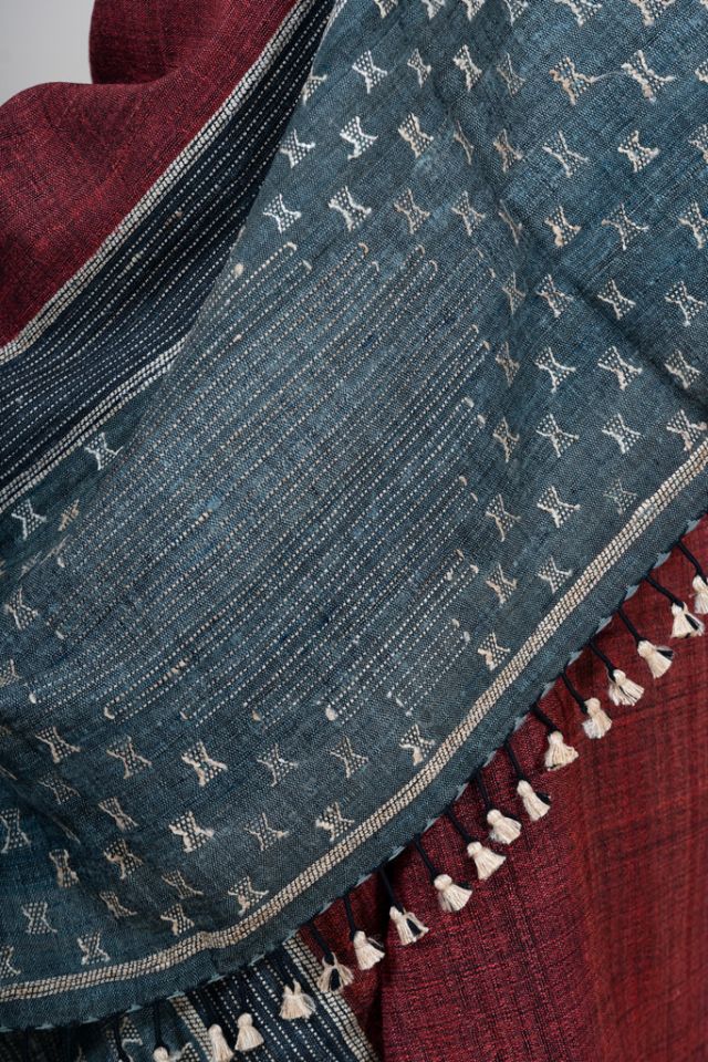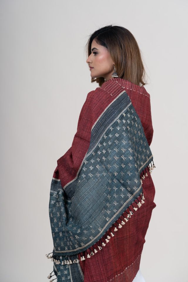 Crafted in vibrant red and blue tones, this merino wool shawl features signature Kutch weaving and tussar silk detailing. Beautifully warm and visually striking — ideal for festive and ethnic looks.
