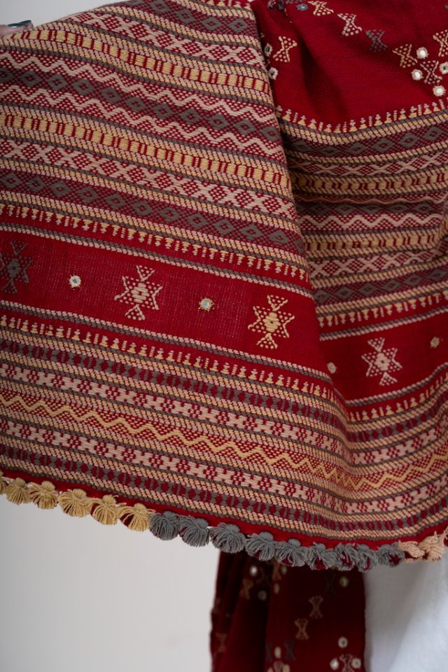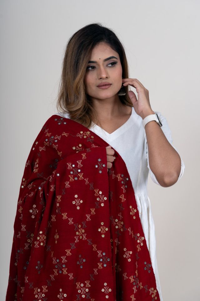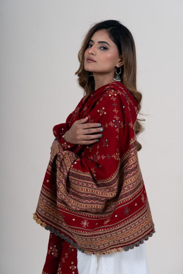 This vibrant red shawl highlights a beautiful blend of checked weaving and authentic Kutch motifs, creating a striking and cultural look. Perfect for celebrations and winter layering. Crafted in durable acrylic wool.
