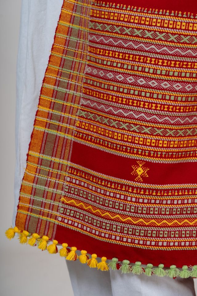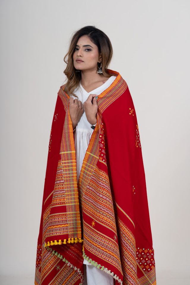 This red shawl has intricate mirror embroidery in the corners with scattered buttas on the body, creating a visually appealing design. Ideal for festive and ethnic wear. Crafted from premium wool.