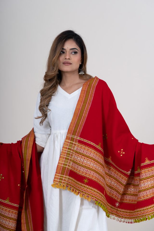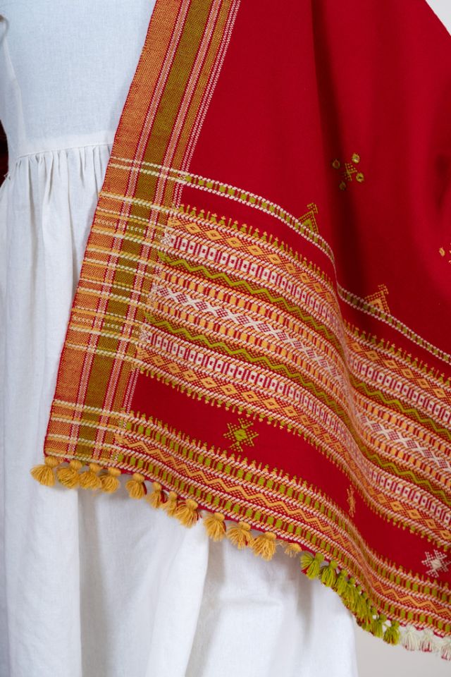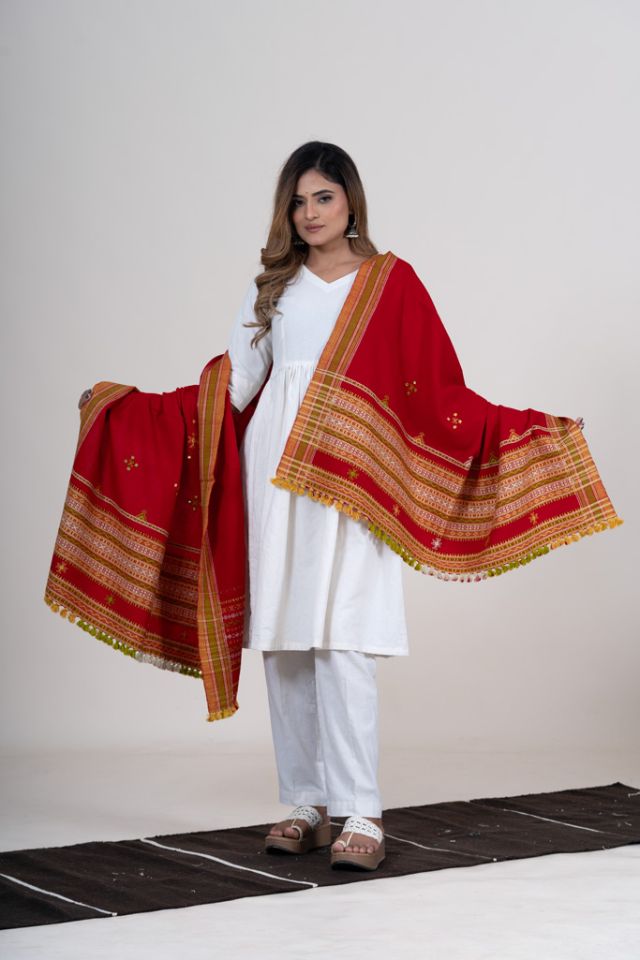 A vibrant red shawl enriched with the iconic Chomukh design, adding a bold and festive touch to winter styling. Crafted from soft acrylic wool.