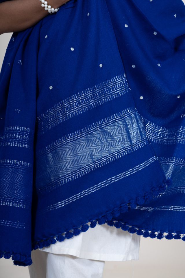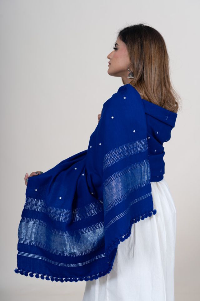A stunning royal blue shawl enriched with traditional zari motifs and shimmering mirror work that reflects fine craftsmanship. Ideal for weddings and celebrations. Woven from soft acrylic wool.