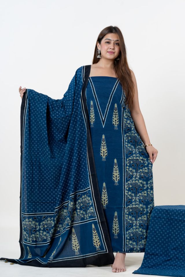 "Showcasing the iconic “Ajrakh Star” pattern in vibrant blue tones, this Ajrakh suit set is paired with an Azure Ripple design. The striped dupatta adds a modern elongated effect, while the hand-block kurta stays rooted in tradition, creating a balanced and elegant ethnic look.
