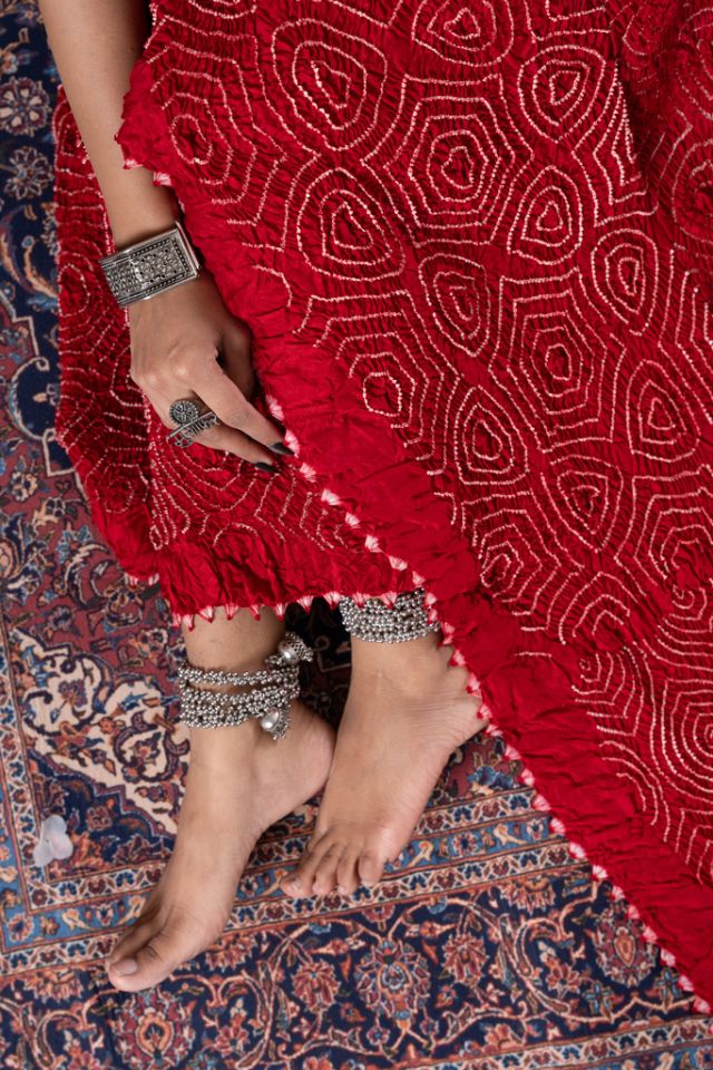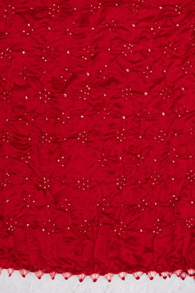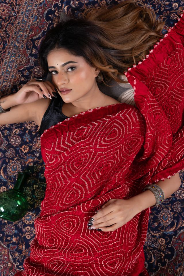 Shop this royal red Bandhej saree in luxurious Chiniya Silk, featuring intricate white Rai Bandhani motifs and a finely crafted designer border. Hand-tied and premium-quality, this traditional Indian saree is perfect for weddings, festive occasions, and luxury gifting. Buy online for a timeless piece of heritage craftsmanship.