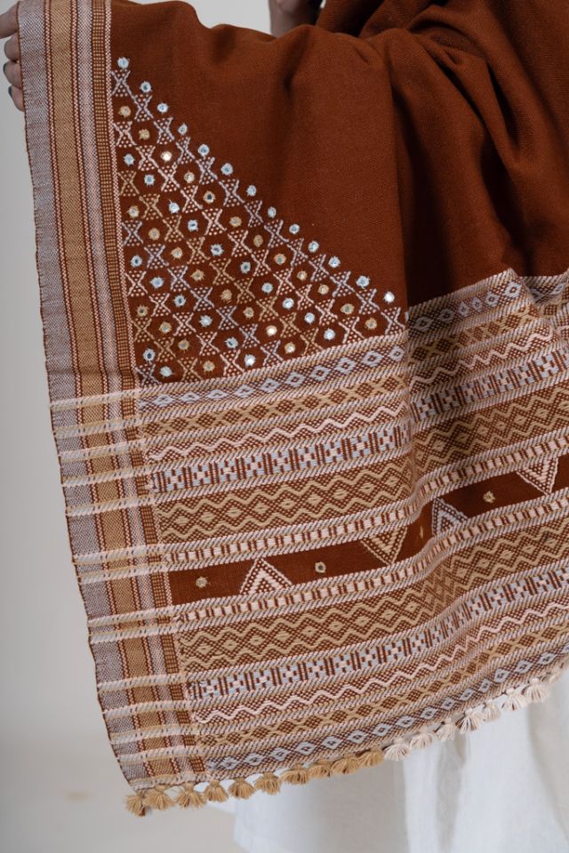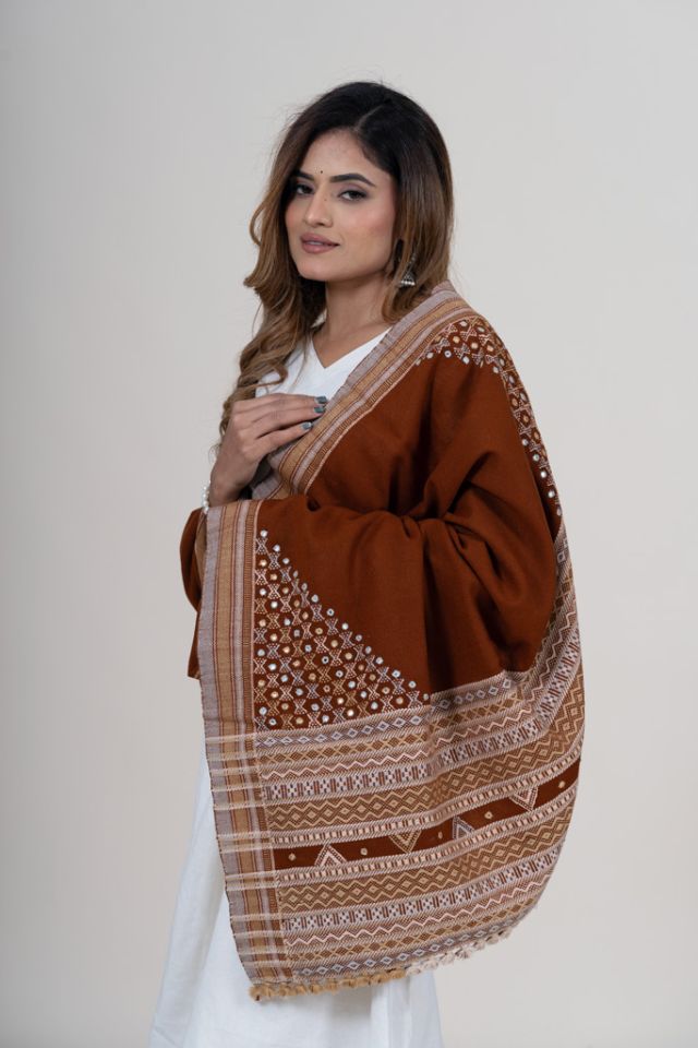 A warm rust-toned shawl with a large central butta design, complemented by hand-embroidered mirror work in the corners. Ideal for festive gatherings and statement winter wear. Made from quality acrylic wool.
