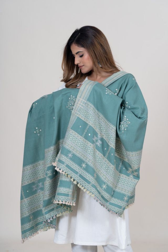 A refreshing sea green shawl highlighted with handcrafted mirror accents and signature Kutch motifs. Lightweight, festive, and stylish for winter gatherings. Made from soft acrylic wool.