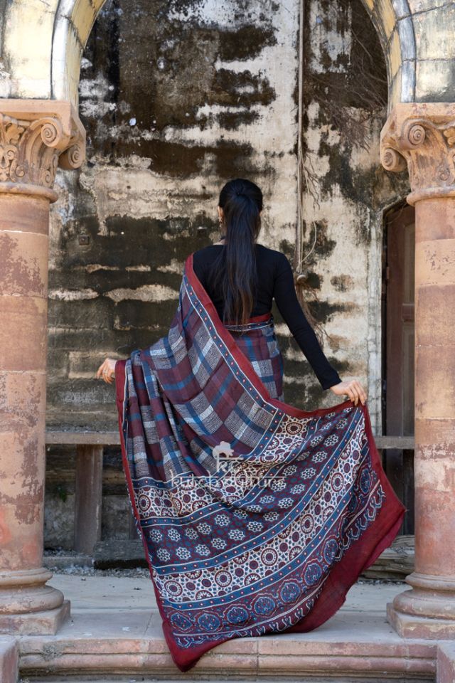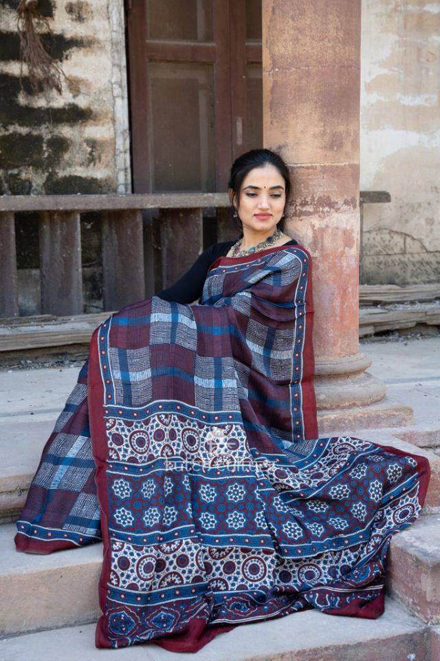 The simple handcrafted ajrakh print modal silk saree reminds us of the old fancy saree design days when we love wearing and looking hot with comfort. The saree will definitely provide you best of comfort and style at the same time.