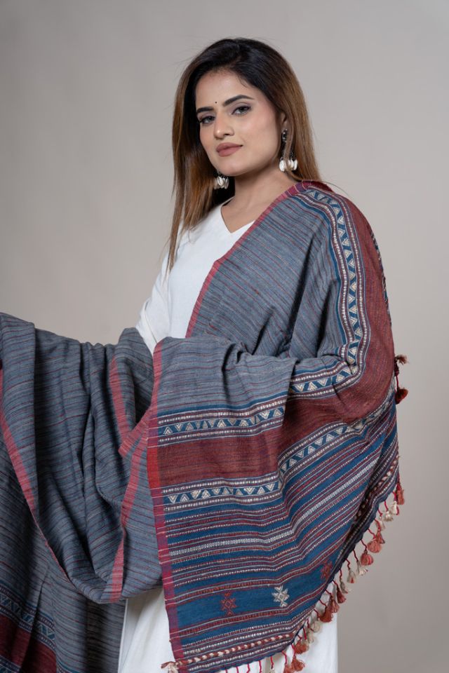 This classy handwoven dupatta features soft cotton with tussar silk stripes, offering a graceful drape and versatile styling options.
