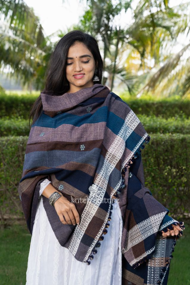 Discover the beauty of traditional craftsmanship with this Kutch handwoven shawl. Featuring earthy-toned stripes and intricate mirror work, it adds a touch of elegance and warmth to your winter wardrobe.length 38 width78