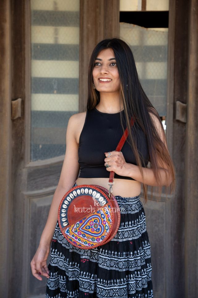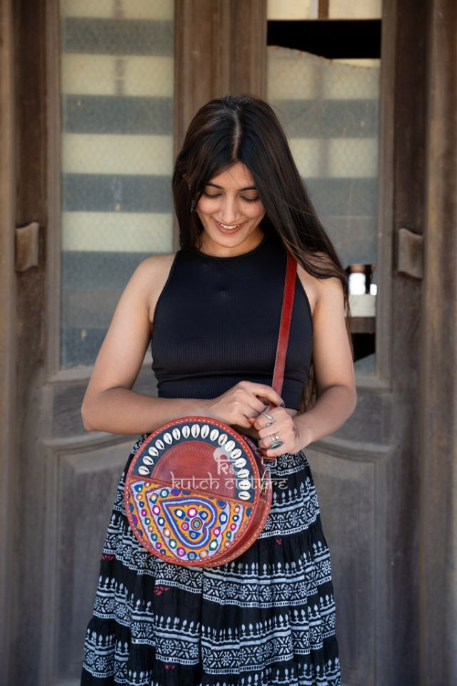 Add a unique ethnic touch to your wardrobe with our round Kutch embroidery sling bags. Made from high-quality leather and adorned with sea shells, these stylish bags are a perfect fusion of tradition and contemporary design.