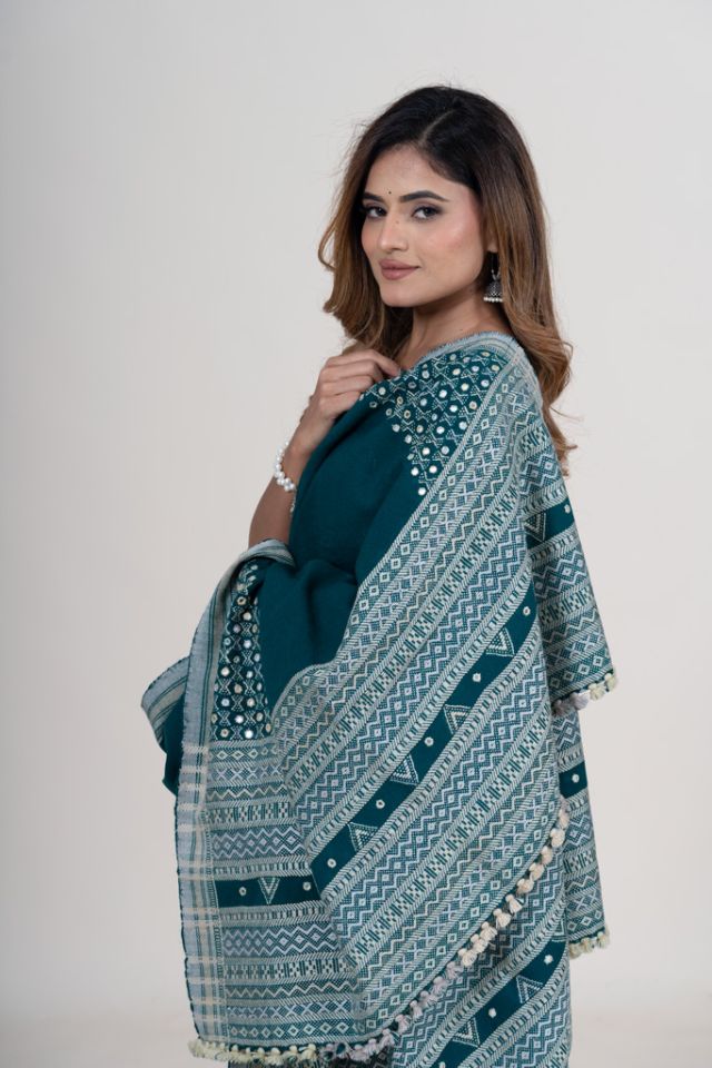 Teal Blue Kutch Shawl with Handwoven Center Butta & Mirror Motifs