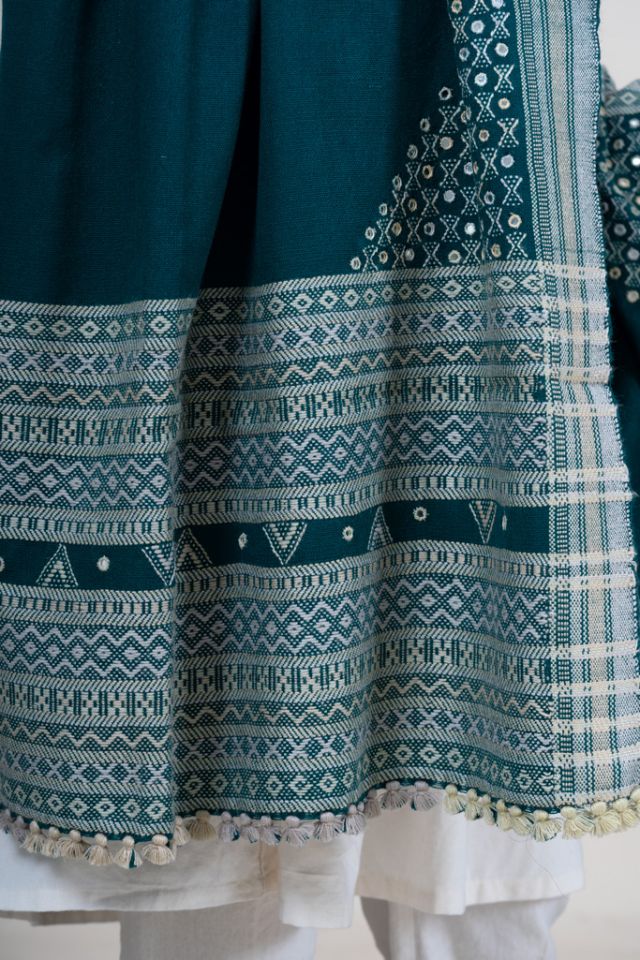 You're reviewing:Teal Blue Kutch Shawl with Handwoven Center Butta & Mirror Motifs