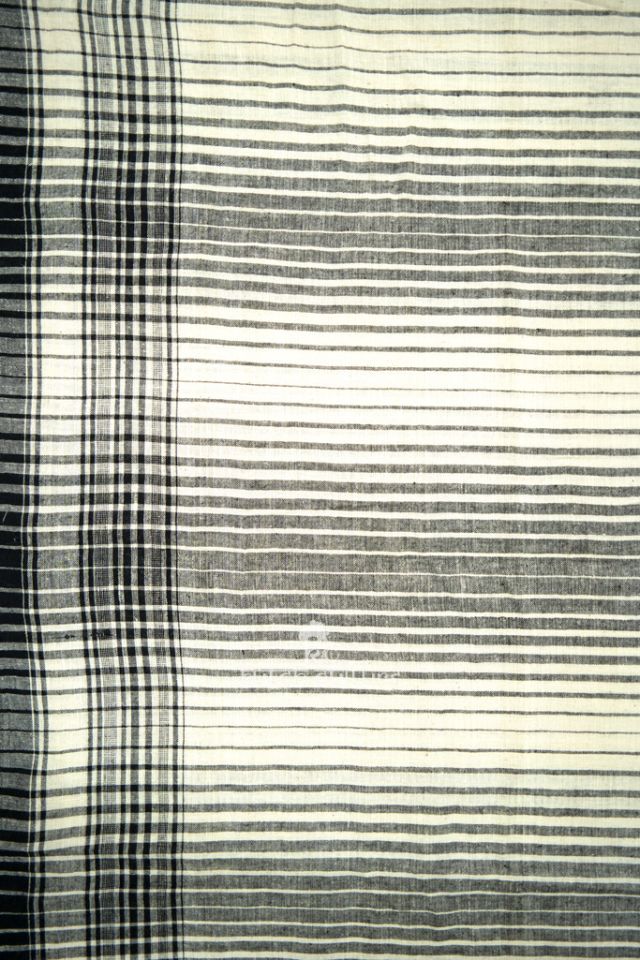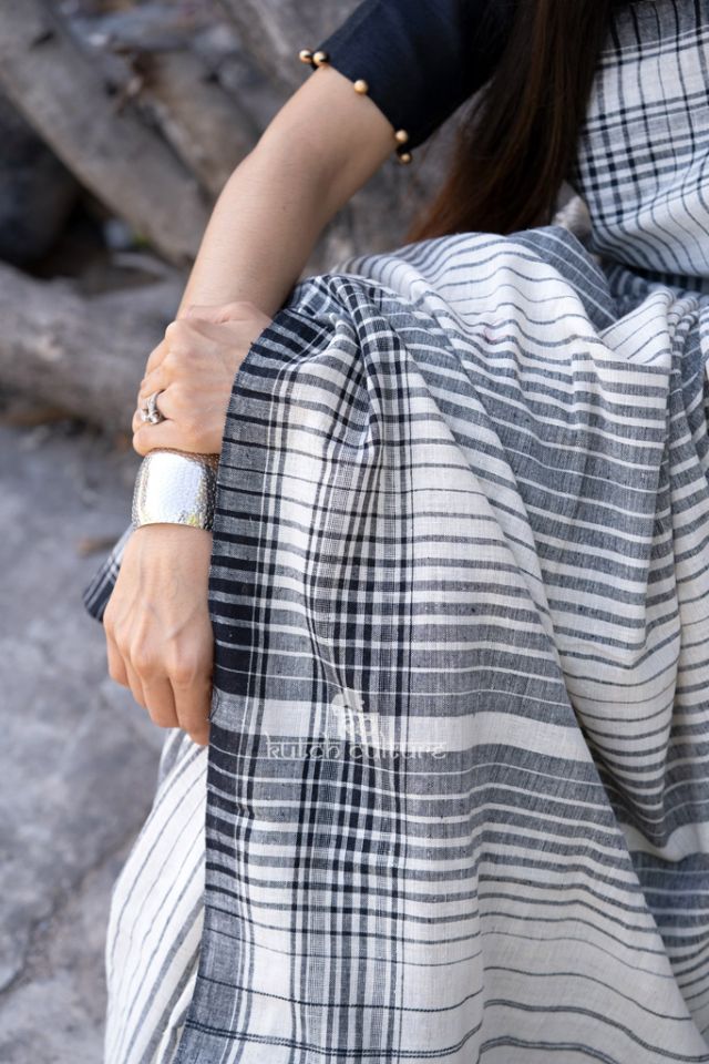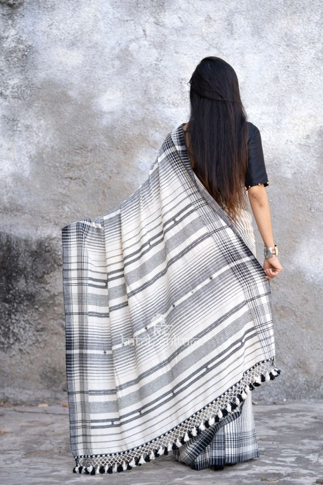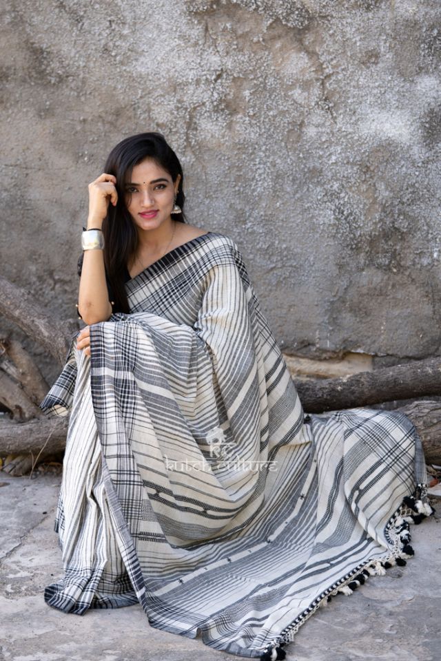 The elegance of this kala cotton saree is unrivaled. The texture of this pure cotton saree and the black and white stripe print along the border & pallu make it graceful. You can add on heavy blouse to finish look.