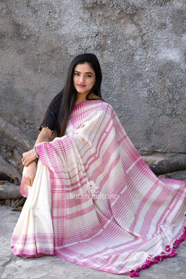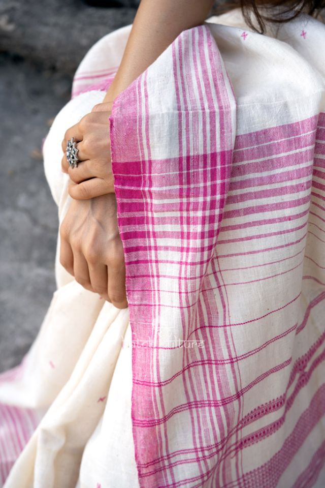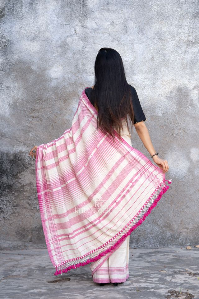 Exclusive Handwoven Fine kala cotton saree white base with Plain body & Border pink With lining,Pallu white base with Traditional Work & with pink Blouse piece attached. Design your blouse with unqiue pattners. And pair it up with high heels.