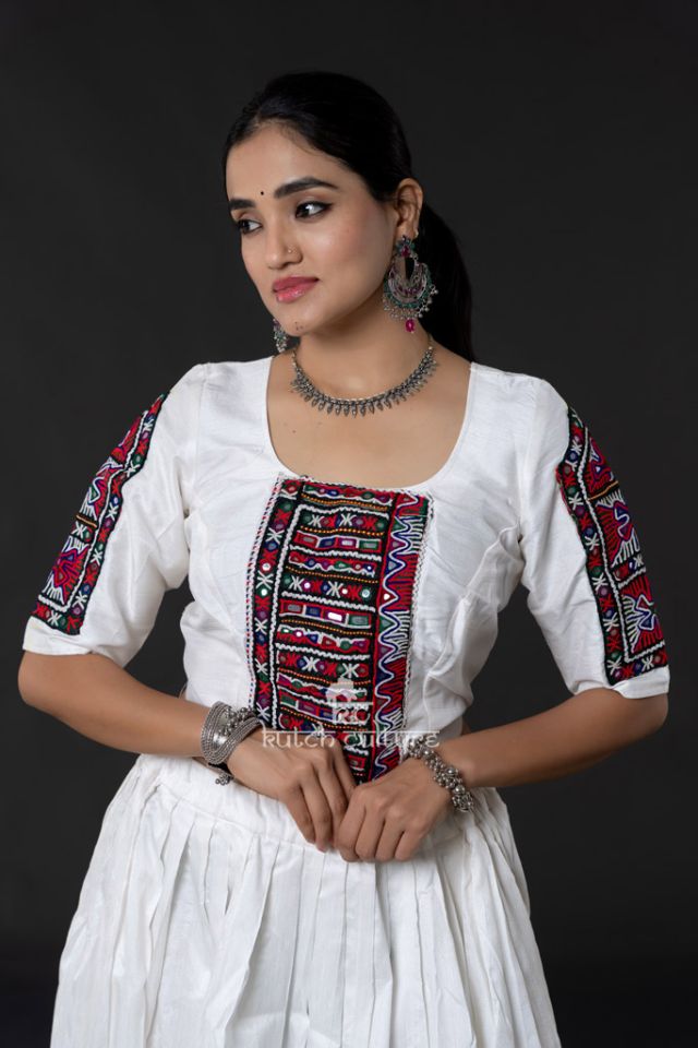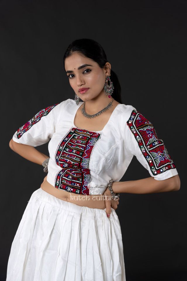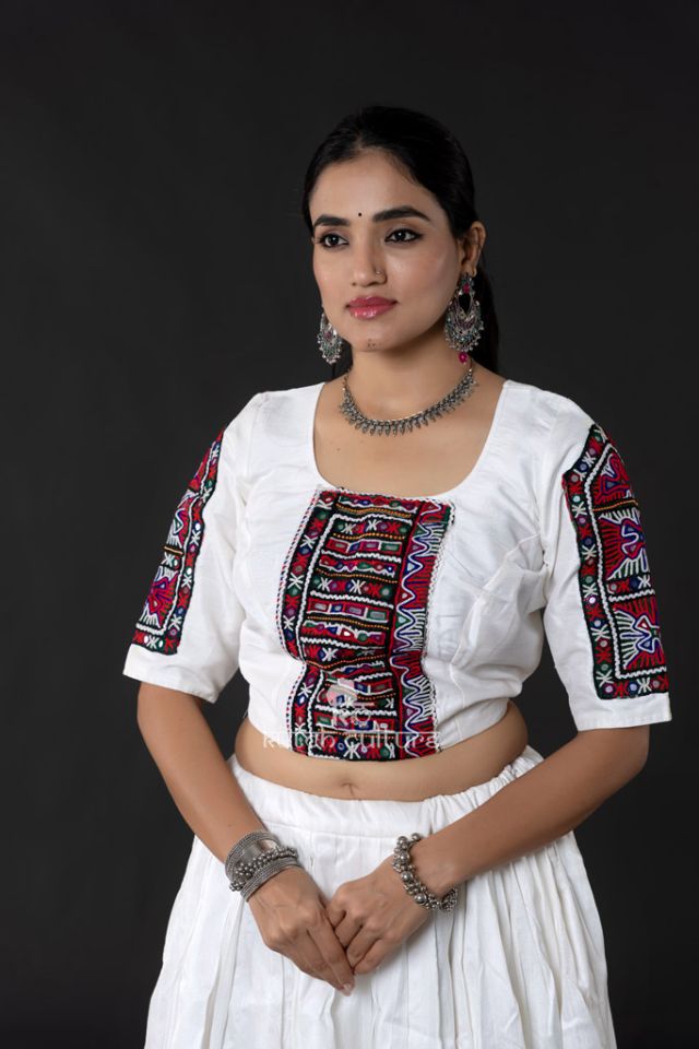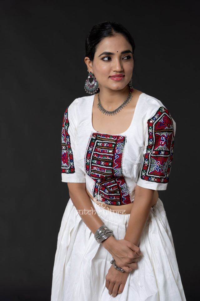 Discover the charm of traditional Rabari craftsmanship with this white chaniya choli, featuring intricate embroidery patches that add a unique bohemian touch. Ideal for festive occasions, sangeet, or casual ethnic outings, this outfit beautifully blends authentic tribal art with contemporary fashion, ensuring you stand out with a touch of elegance and cultural pride.