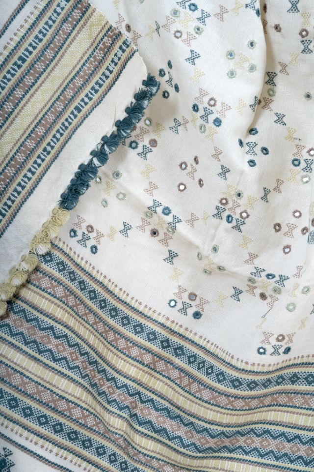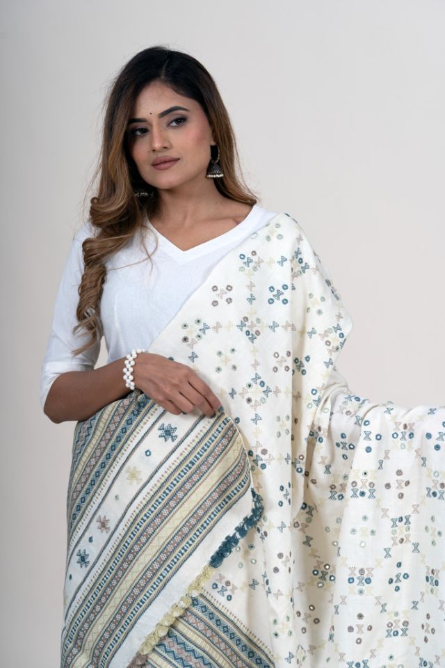 This elegant white shawl is designed with beautiful checked weaving and timeless Kutch motif work, creating a refined ethnic aesthetic. Ideal for cultural events and everyday elegance. Made using high-quality acrylic wool.